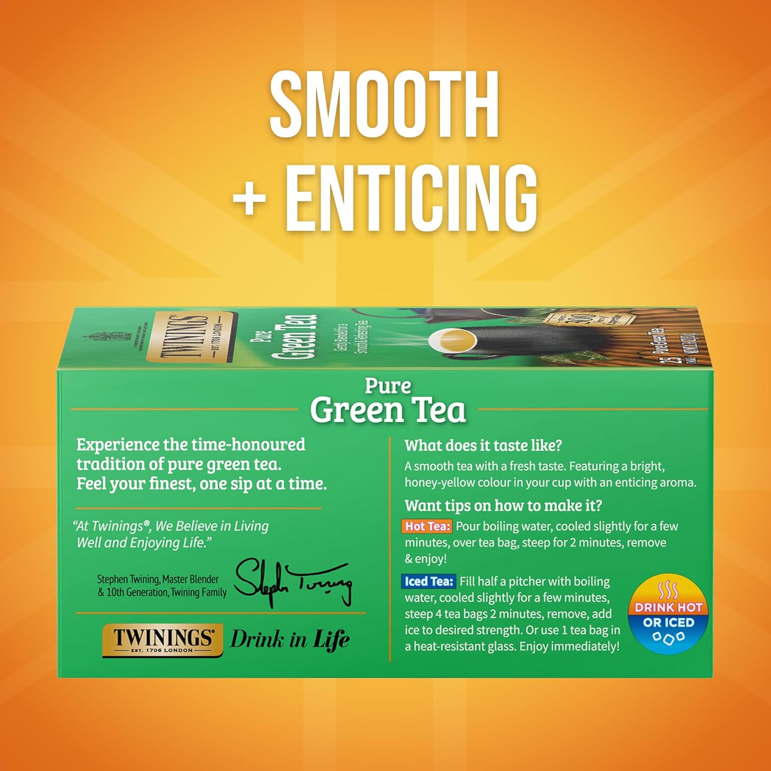 Twinings Pure Green Tea Individually Wrapped Bags, 25 Count (Pack of 6), Smooth Flavour, Enticing Aroma, Caffeinated, Enjoy Hot or Iced, 150 Teabags