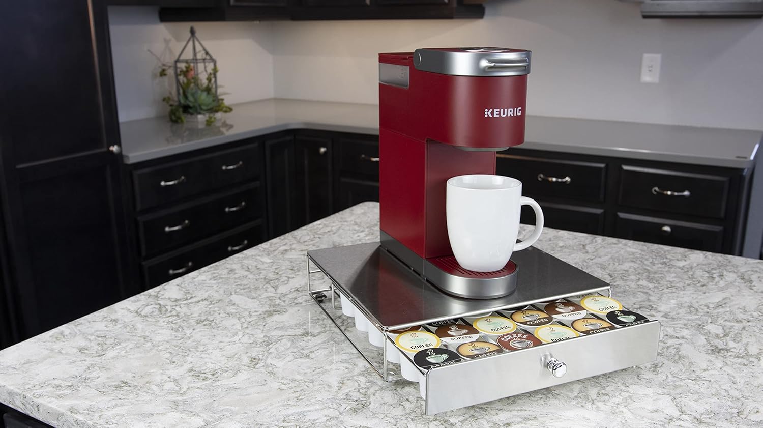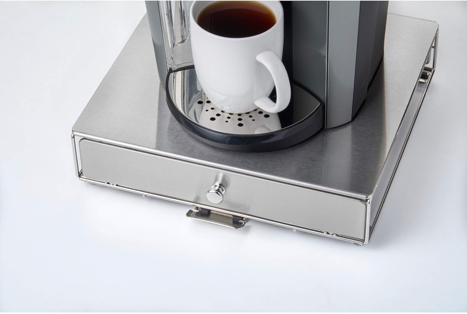 - KITCHEN ORGANIZER: The functional and hassle-free style allows you to stand any coffee brewer on top of the drawer. With a classy stainless-steel design, this holder will fit perfectly into your kitchen, dorm countertop, or office coffee bar.
