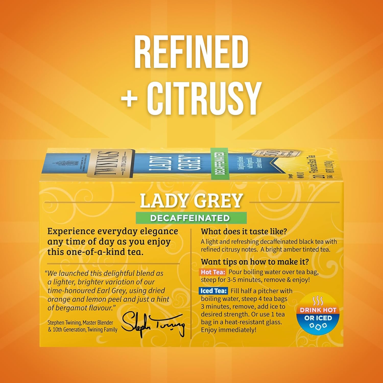 Twinings Decaffeinated Lady Grey Black Tea Individually Wrapped Bags, 20 Count (Pack of 1), Orange Peel & Lemon Peel, Enjoy Hot or Iced, 20 Teabags