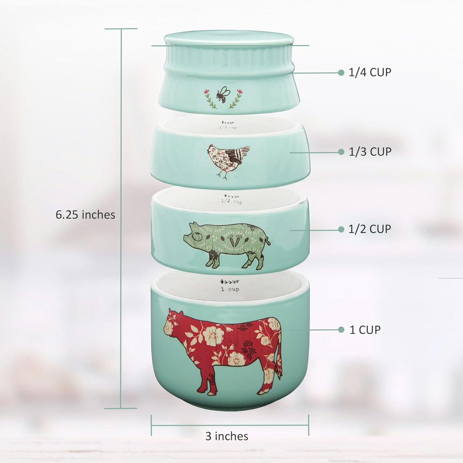 Pavilion Gift Company - 'Live Simply Bee, Chicken, Pig, and Cow' - 4-Piece Stoneware Measuring Cups Set, Sturdy Farmhouse-Style Kitchenware for Home Baking, Cooking, Gifting - Teal, 8 Ounces