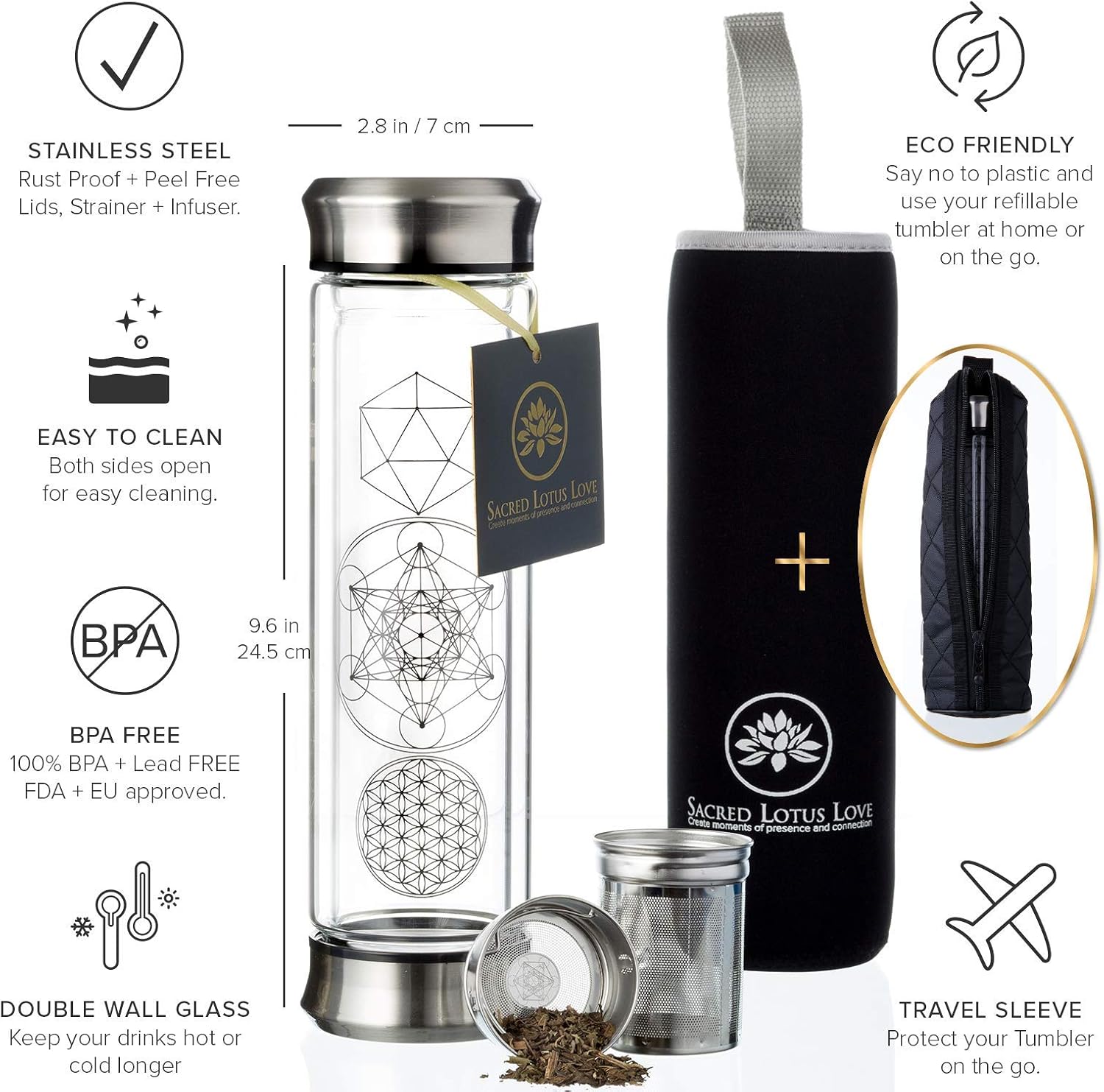 Sacred Lotus Love Double-Walled Glass Tea Infuser Bottle - Portable Travel Mug with Strainer and Sleeve for Loose Leaf Tea, Coffee, Smoothies - Insulated Tumbler with Lid for Hot and Iced Beverages