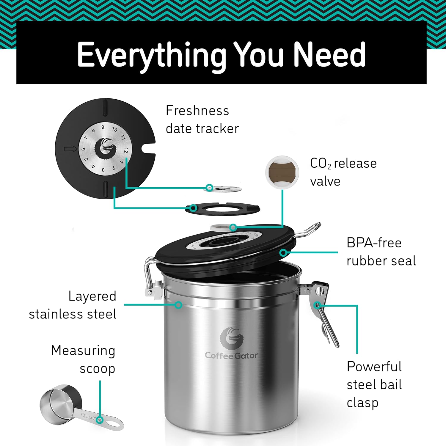 Coffee Gator Coffee Storage - 11oz Small Stainless Steel Tea and Sugar Containers - Stainless Steel Canisters with Date-Tracker, CO2 Valve for Freshness & Scoop - Silver