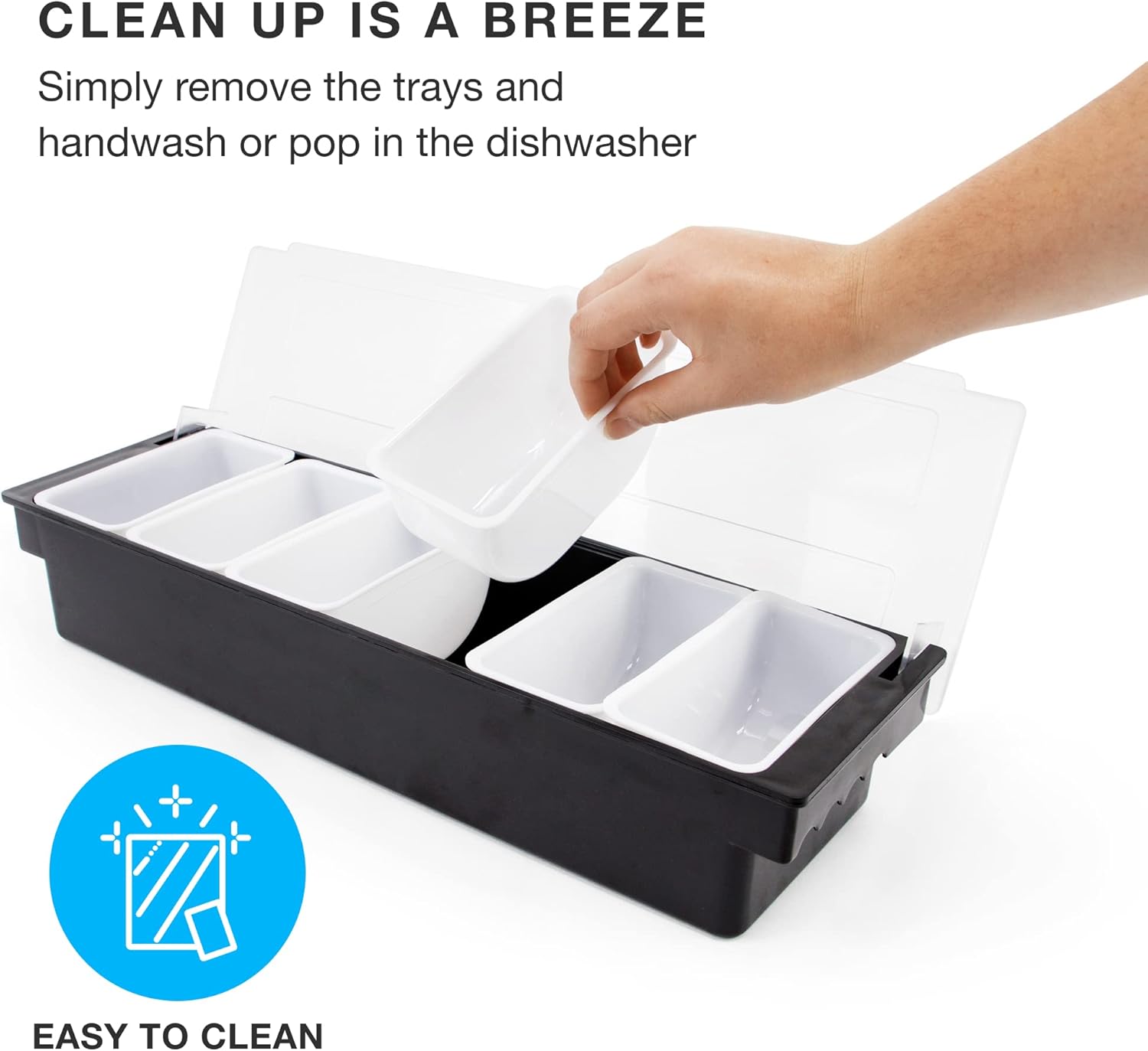 - Condiment Containers with Lids - Whether you're looking for bar accessories or a taco bar serving set for a party, there's a Cocktailor condiment organizer for you. The extra-spacious 6-tray garnish station measures 19" x 5.5" x 3.5" and holds over 12 cups of condiments and garnishes