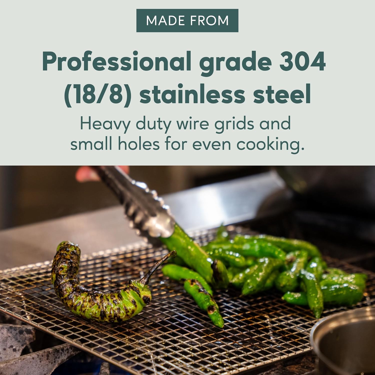 - HEAVY DUTY STAINLESS STEEL, STURDY DESIGN: Set of 2 cooling racks for quarter sheet baking pans are food-safe, professional grade 304 (18/8) stainless steel with strong, heavy duty wire grids, small holes, smooth no-snag edges, and a full 1 inch height resulting in greater all around airflow for even cooking, cooling and roasting every time