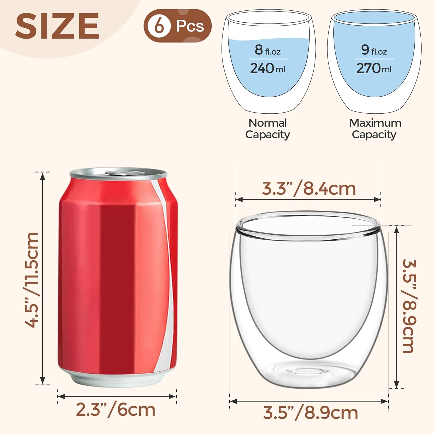 ComSaf 8oz Glass Coffee Mugs Set of 6, Double Walled Insulated Thermal Mugs for Latte Cappuccino Cocoa Milk Cafe Juice Tea, Clear Espresso Cups Set Glassware Gift for Christmas Birthday