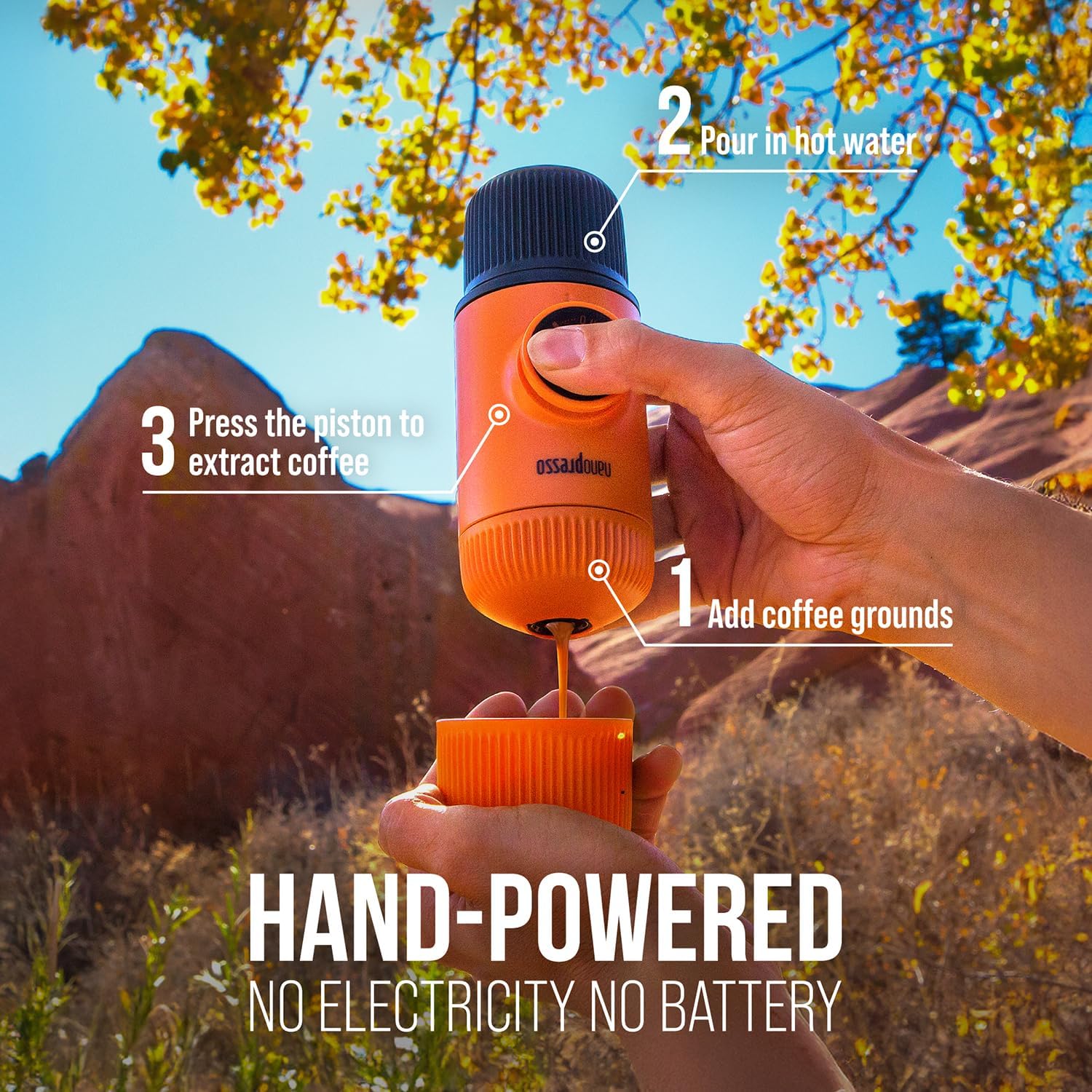 WACACO Nanopresso Portable Espresso Maker, Upgrade Version of Minipresso, 18 Bar Pressure, Small Travel Coffee Machine, Manually Operated, Perfect for Kitchen and Office, Orange
