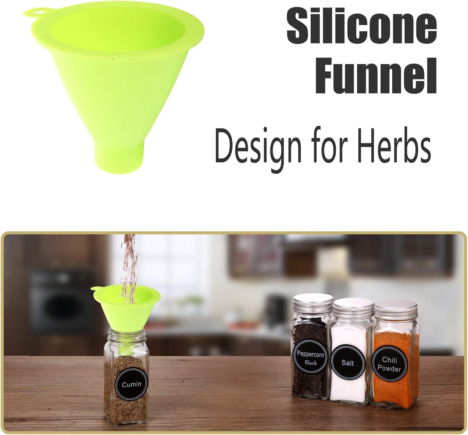 - CONVENIENT SILICONE SPICE FUNNEL: The funnel specially designed for spice makes it easier to add new spices to your seasoning containers. Mini spice jars are great for drawer, cabinet, spice rack,cupboard,organizer.Organize your spices with our spice containers with labels set, Which makes your kitchen clean and tidy.
