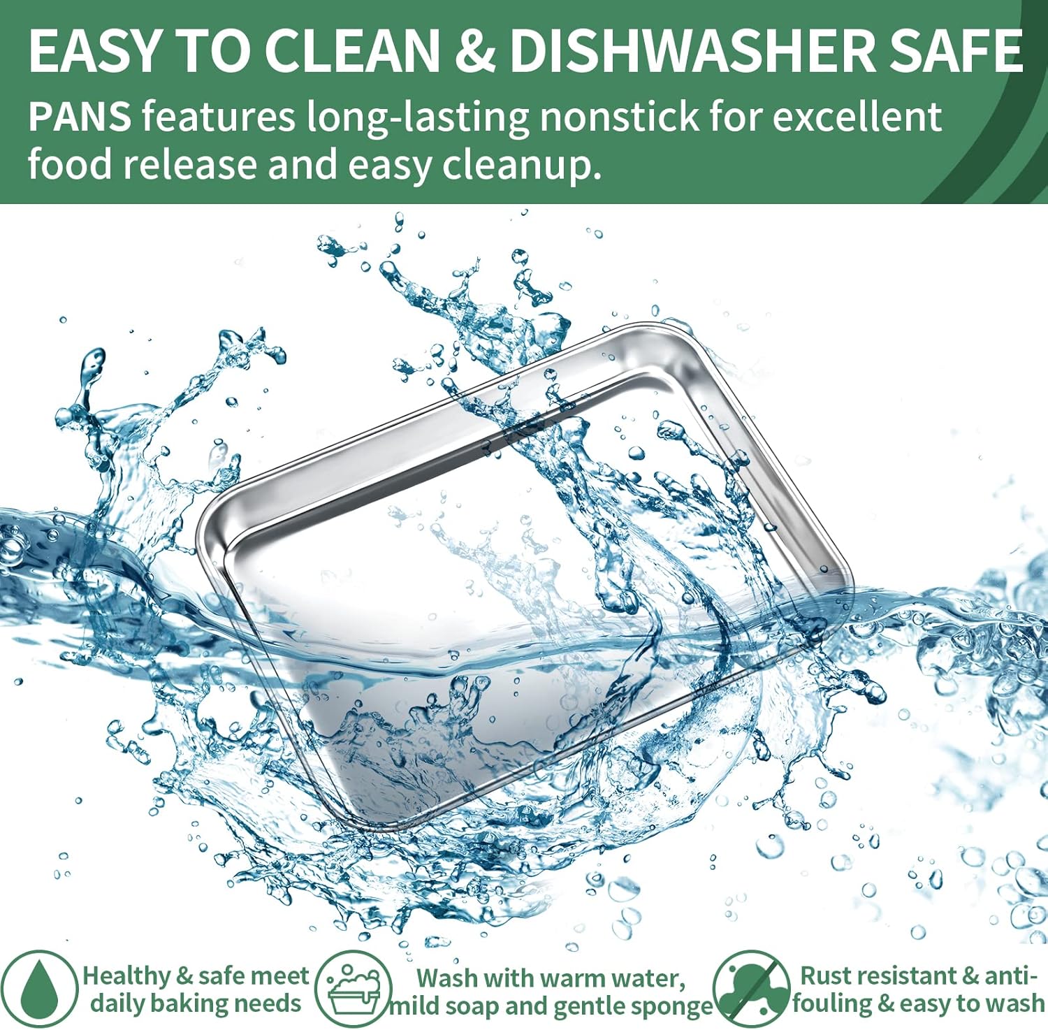 - Easy Clean & Leak-Proof & Nonstick: Nonstick stainless steel baking pans tray keep food contained and prevent food juice flowing everywhere, Keeping your oven neat. Dishwasher can save your time and labor after using.Easy to clean up even in hand-wash. Stainless steel cookies pan features long-lasting nonstick for excellent food release and easy cleanup