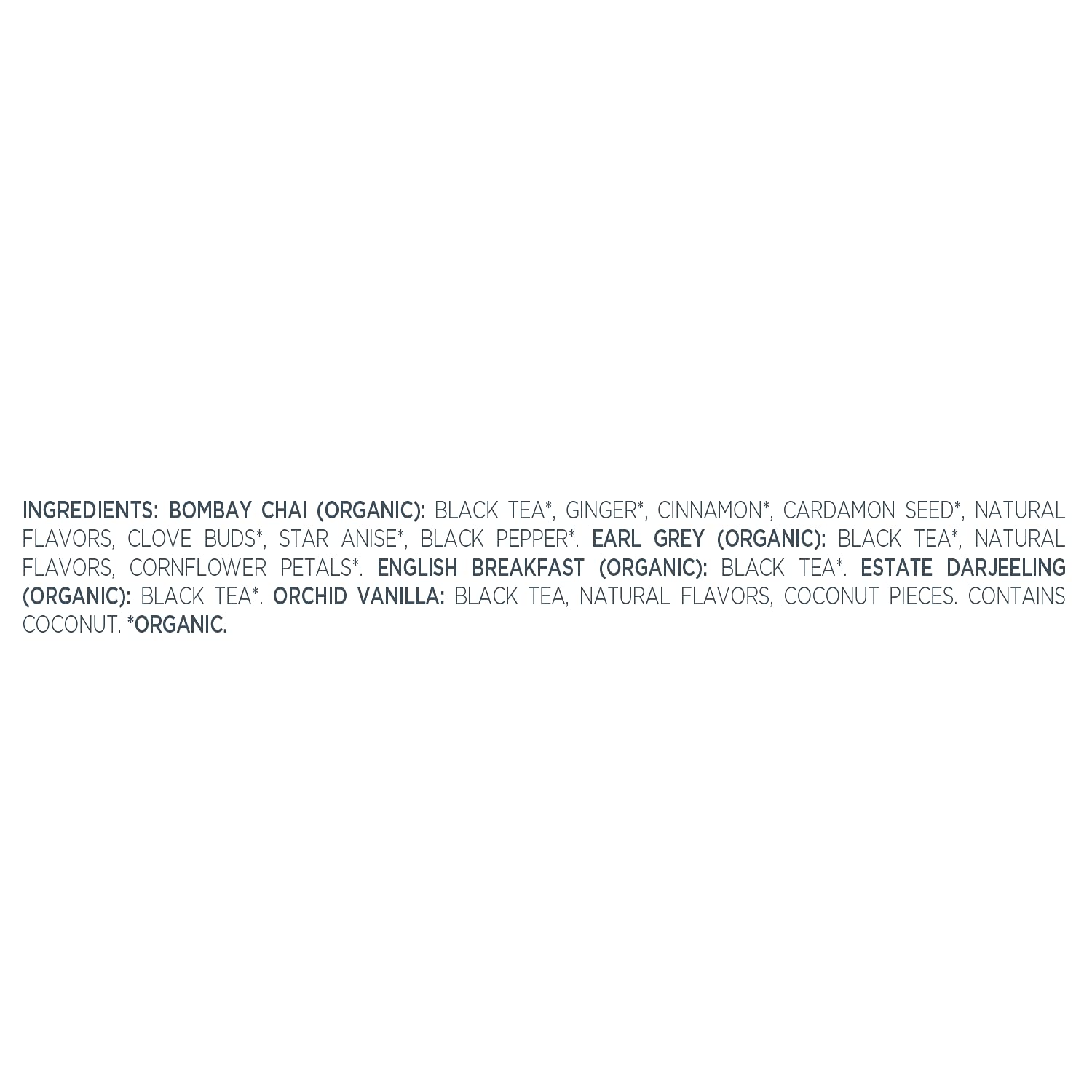 - ORGANIC BLACK TEA SAMPLER with five varieties of the world's finest black tea blends - Bombay Chai, Earl Grey, English Breakfast, Estate Darjeeling, Orchid Vanilla.