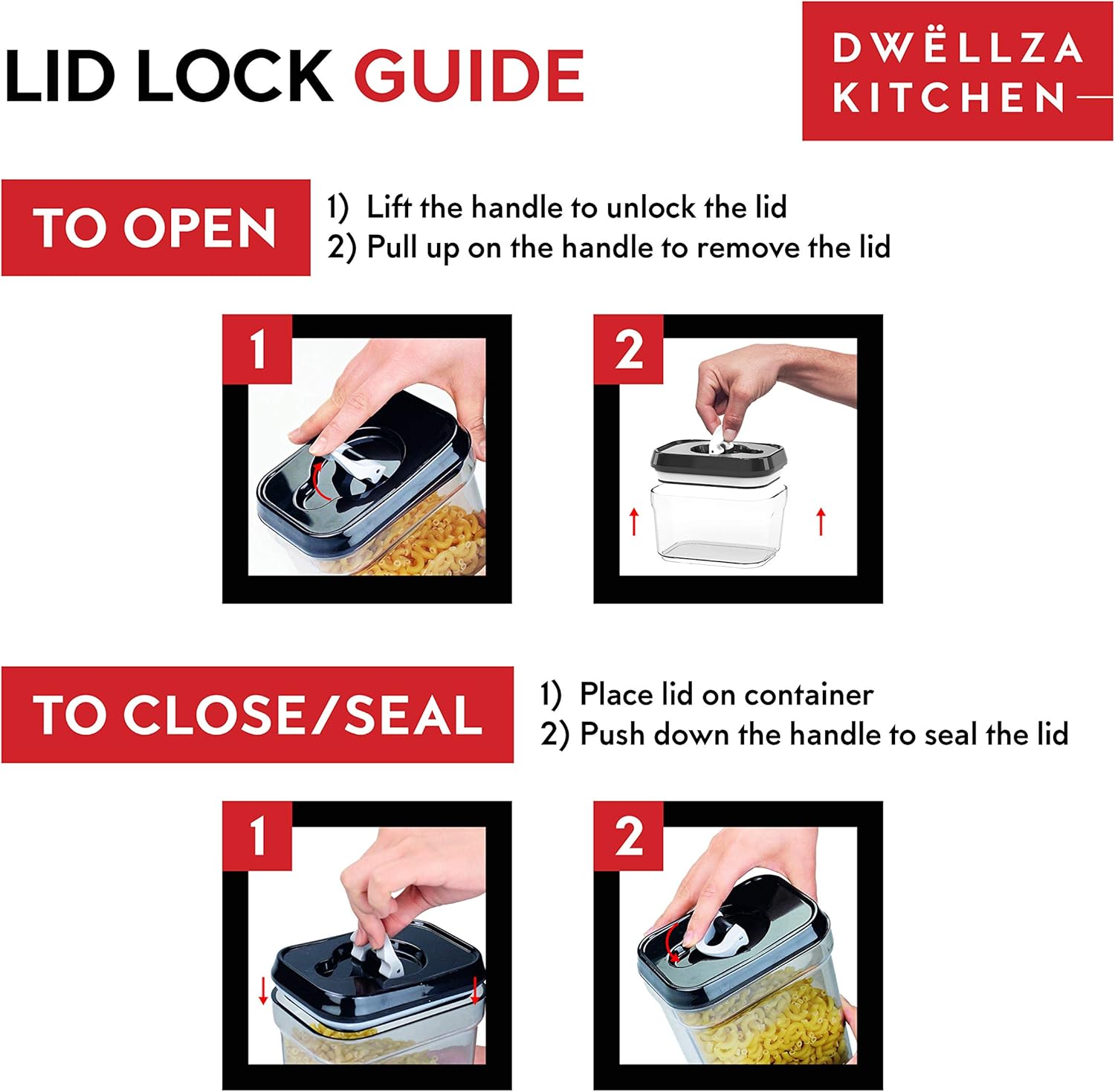 - Satisfaction Guarantee: We’ve got your back. Dwellza Kitchen food storage containers for pantry canisters are backed by a total satisfaction guarantee. Reach out to us in case of any issues and we’ll do all we can to make you smile. Click ‘Add to Cart’ now to keep your pantry organizer, your food fresh, and your kitchen looking oh so elegant!