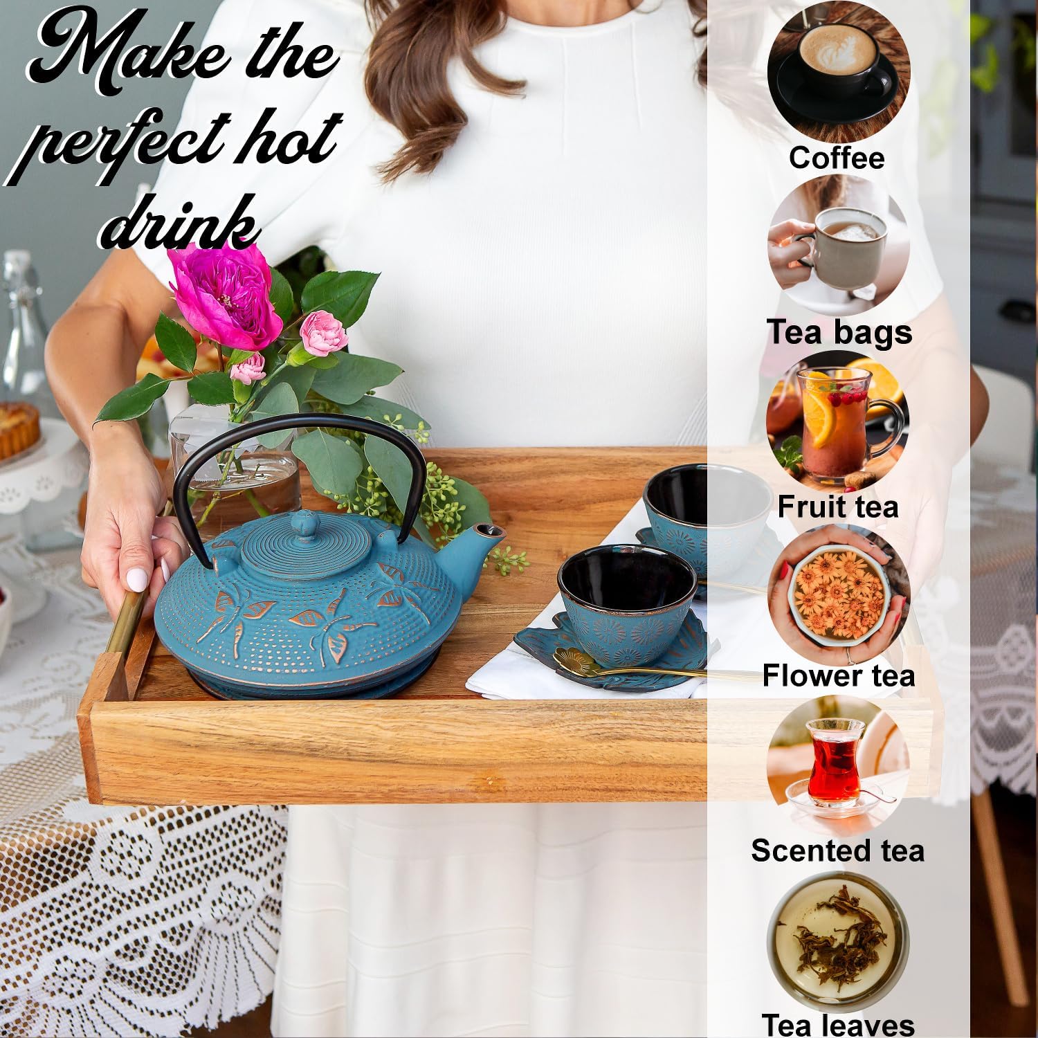 7PC Japanese Tea Set. "Blue Butterfly" Cast Iron Tea Pot with 2 Tea Cups, 2 Saucers, Tea Infuser and Teapot Trivet. Ceremonial Matcha Accessories