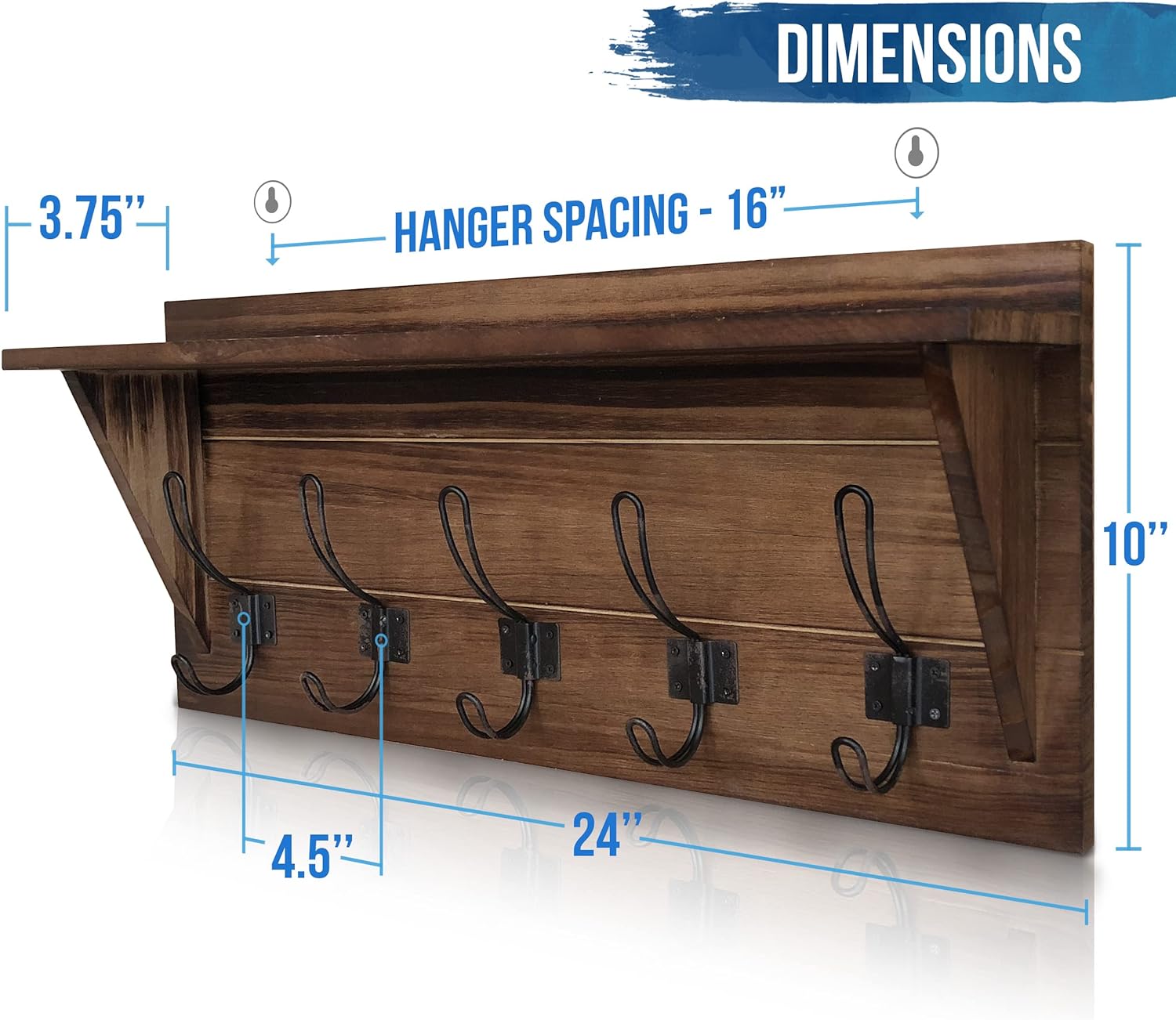 - The 24" length is ideal for all areas. The 5 sturdy hooks and flat 3.75 inch shelf makes this rack perfect. Add a touch of rustic beauty to your entryway, hallway, kitchen, bedroom or anywhere else. Each coat rack comes with screws and anchors included making ready to hang out right out of the box!