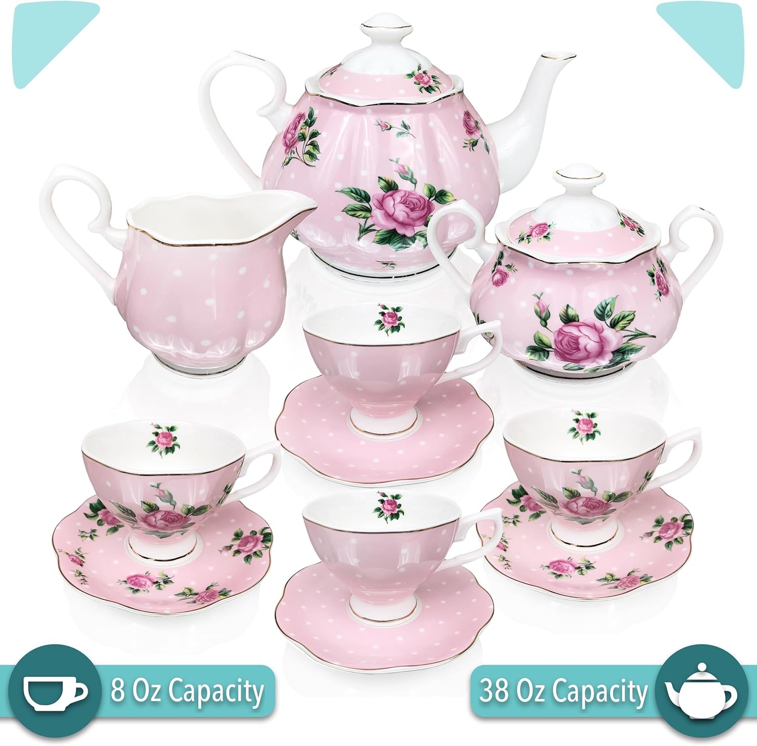 BTaT- Floral Tea Sets for Adults, 13 pcs, Service for 4, Pot (38 oz) & Cups (8 oz) with Saucers, Pastel Pink Floral Design with Gift Box, Porcelain Tea Set for Adult, Dishwasher Safe