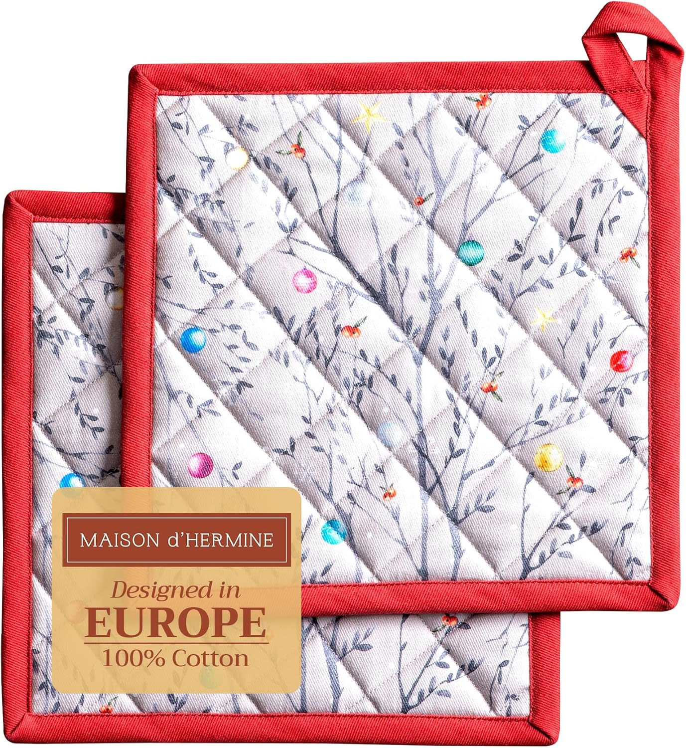 Maison d' Hermine Pot Holders Set 100% Cotton Heat Resistant Potholders 8" x 8" Hot Pads with Loop BBQ, Cooking, Baking, Grilling, Kitchen, Handling Hot Pans (Pack of 2, Fairy Christmas)