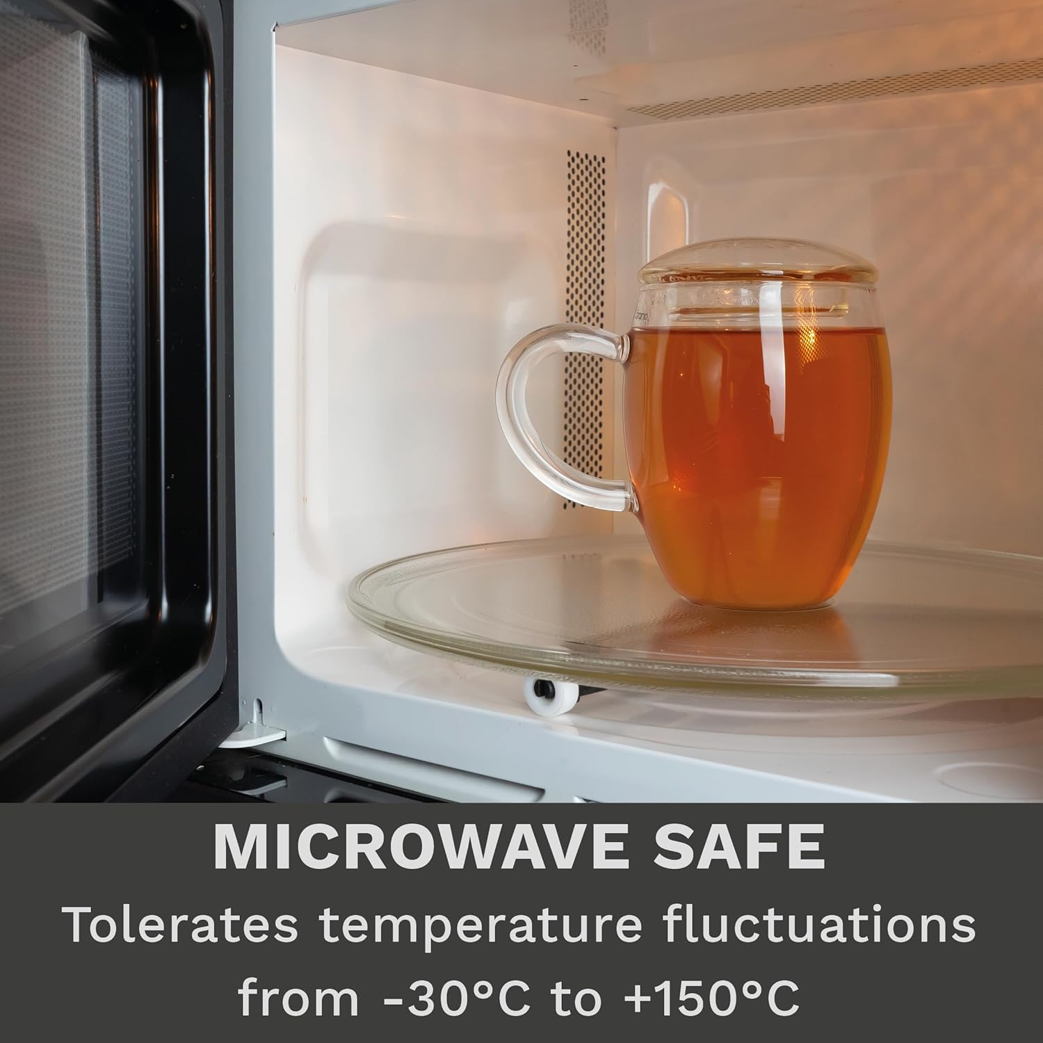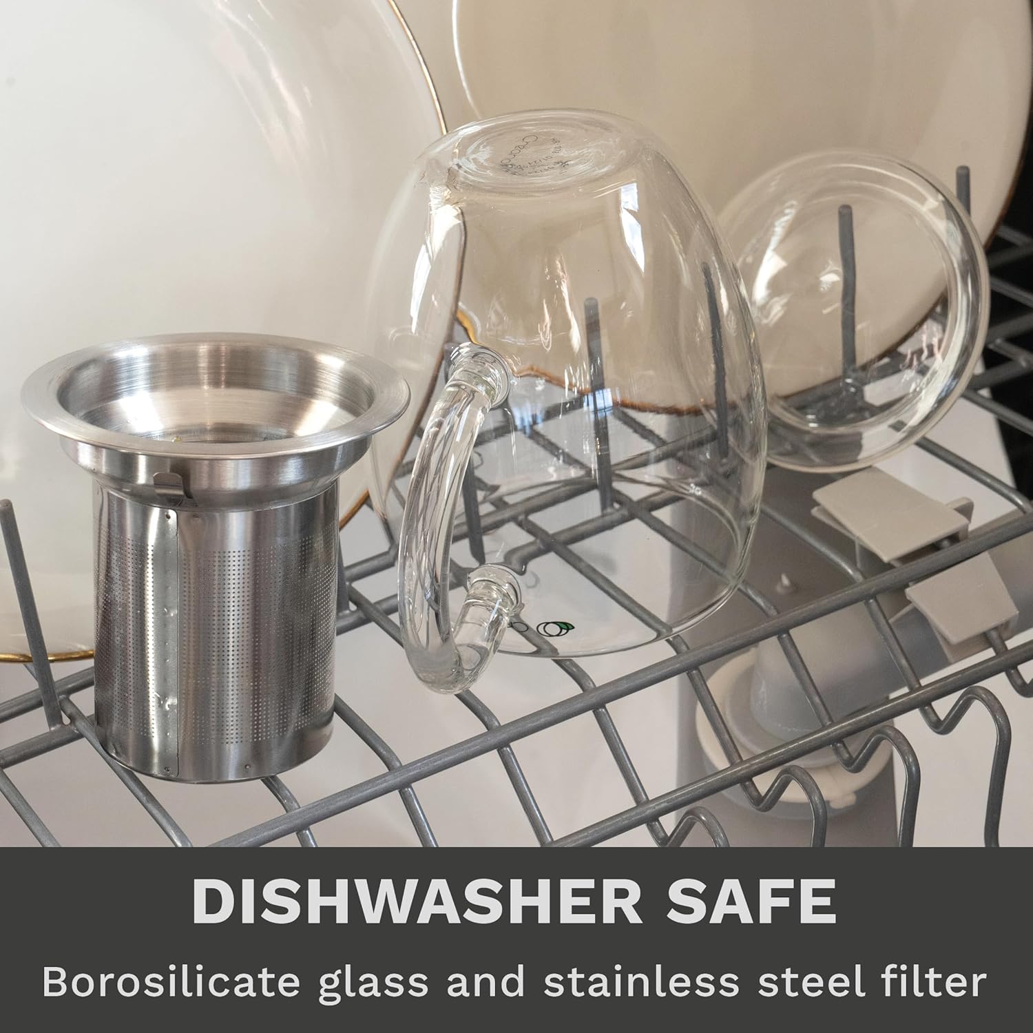 - OFFER: 2x 14oz tea glass with handle, stainless steel filter and lid made of clear high quality borosilicate glass, which keeps hot drinks warm a little longer. The all-in-one tea glass is made for the enjoyment of high quality tea of all kinds like loose tea, fruit tea, green tea, black tea and tea bags. Delivered in a high-quality gift box.