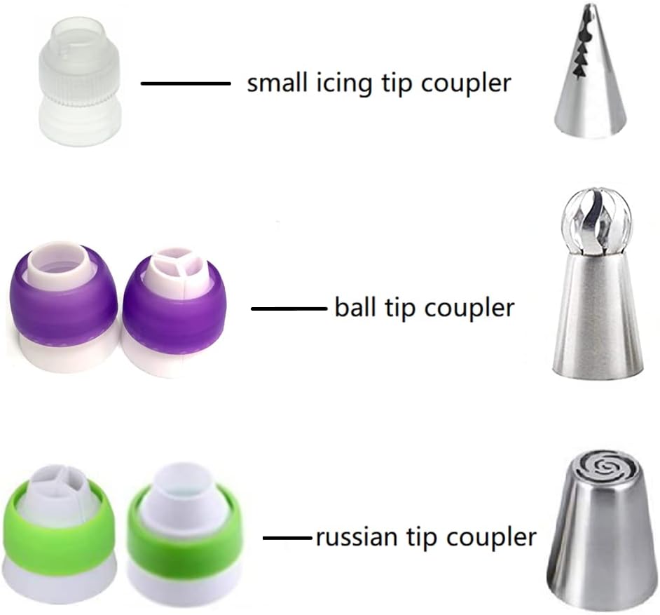 - 【Accessories】: Silicone icing bags set includ 10pcs 18 inch piping bags,10 decorating bags ties, 6 small piping tips couplers,2 ball tips couplers (purple) and 2 russian tips couplers (green).