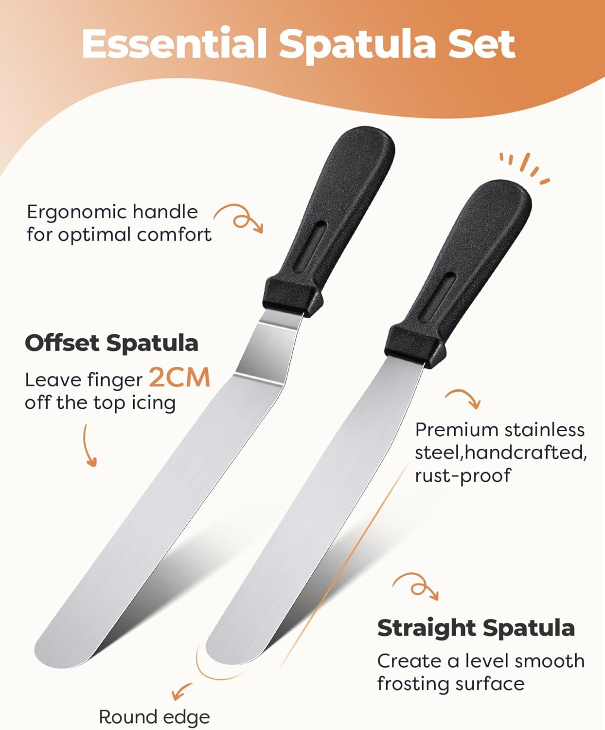 - Straight and Angled Frosting Spatulas: These high-quality stainless steel frosting spatulas make it easy to even out frosting and work on layered cakes. With a 12.5-inch angled spatula and a 10.6-inch straight spatula, you can create even crumb layers and perfect surfaces.