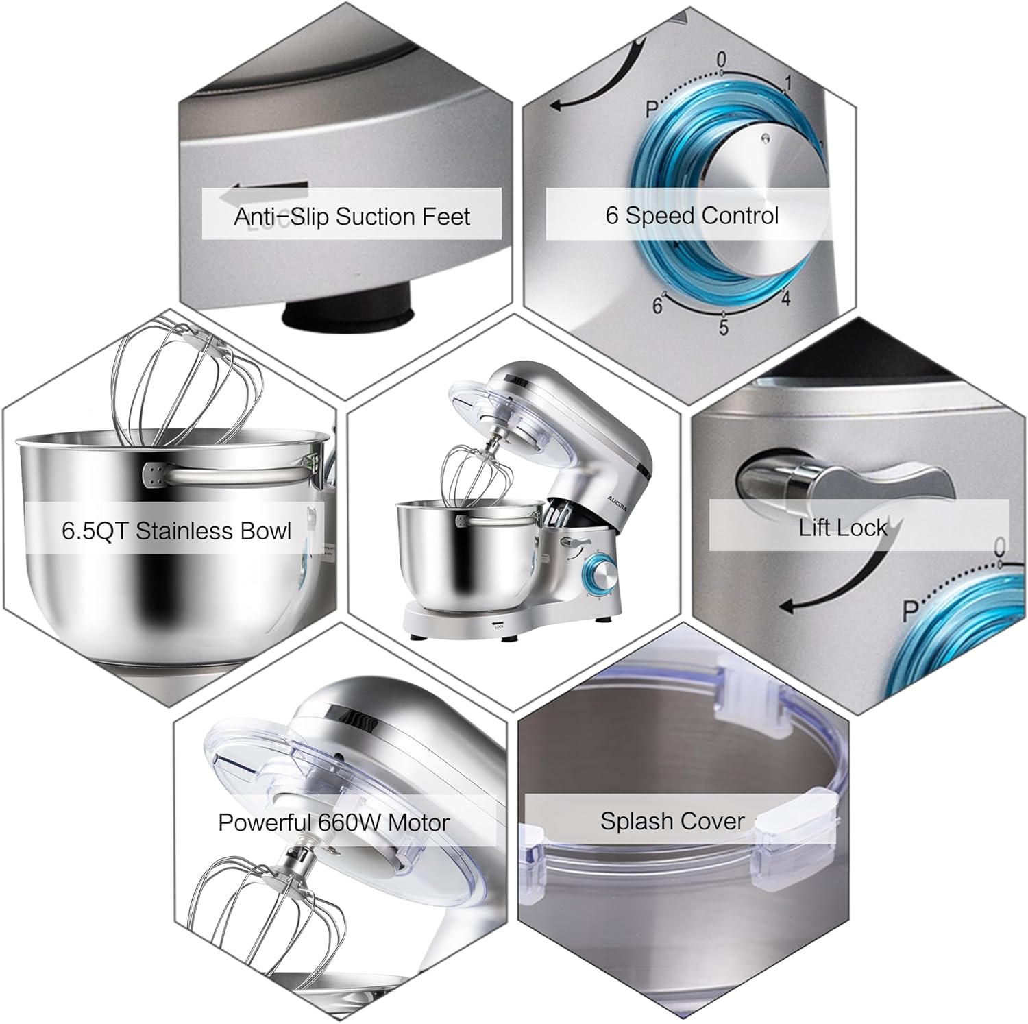 Aucma Stand Mixer,6.5-QT 660W 6-Speed Tilt-Head Food Mixer, Kitchen Electric Mixer with Dough Hook, Wire Whip & Beater (6.5QT, Silver)