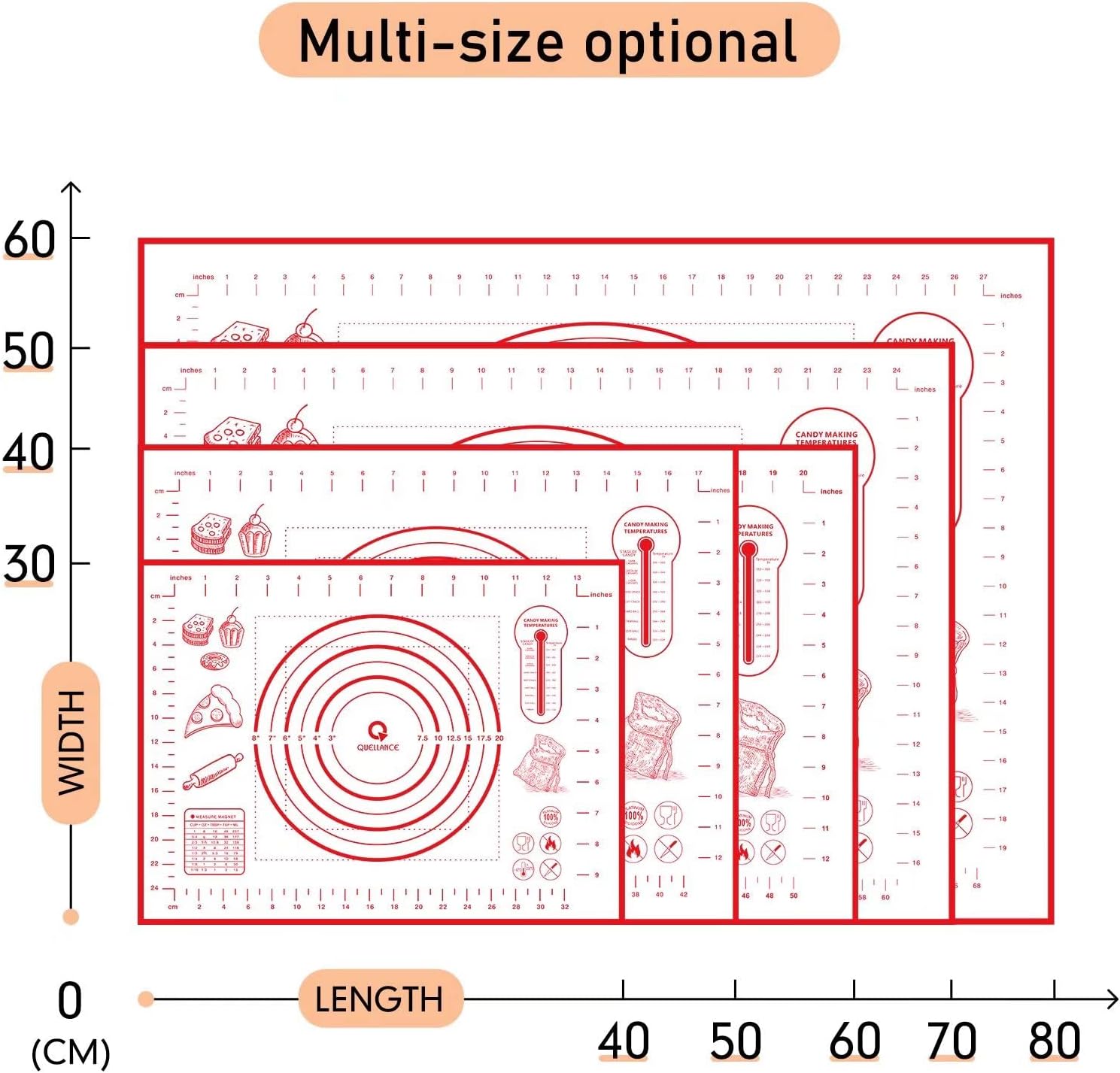 - Premium Silicone Bakig Mat: Our silicone pastry mat made of 100% Food-Grade Silicone, no harm to the body, safe use for temperatures of -45 degrees F (-43 C) to 450 degrees F (230 C), no unpleasant chemical odors, providing you more time to enjoy your creations.