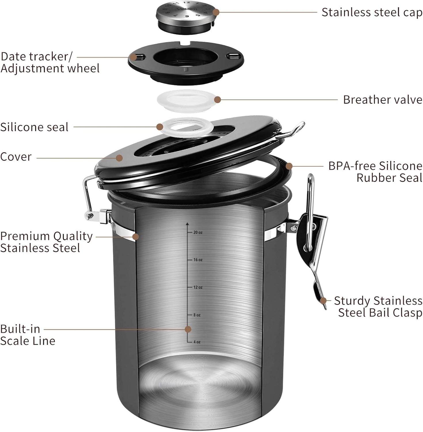 - Date Tracker & Free Scoop - Ensure your coffee is always fresh and not expired. You can set the storage or expiry dates with the date tracker on the lid of your Veken coffee storage canister. We also offer a free stainless steel coffee scoop, which can be attached to the hook!