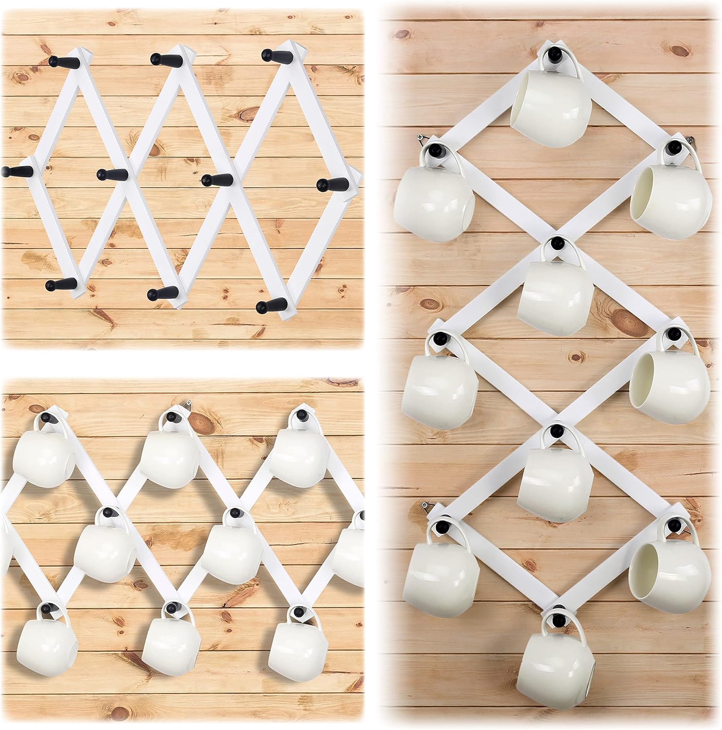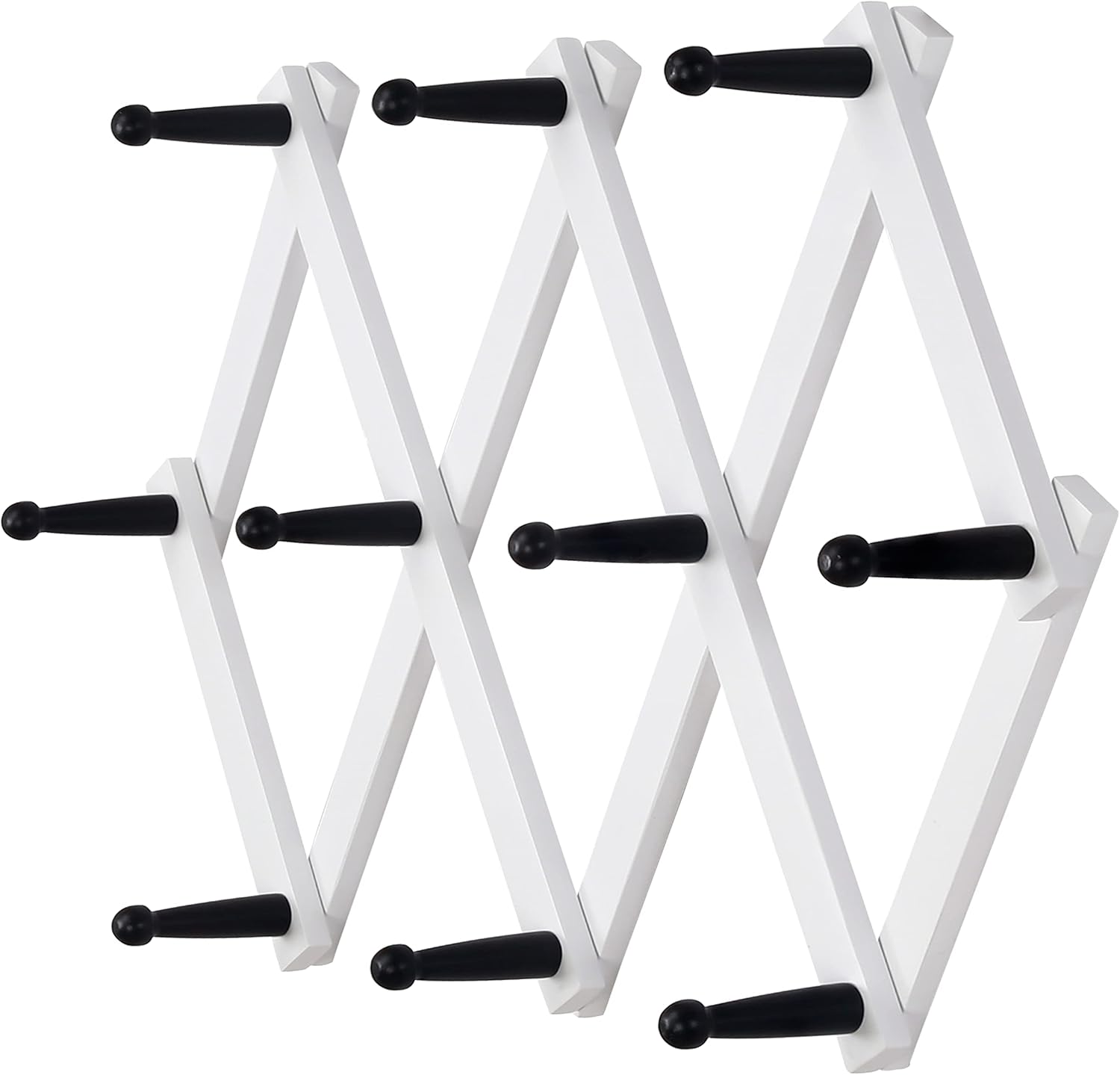 Dseap Accordian Wall Hanger: 16” High Wooden Wall Expandable Coat Rack, Hat Rack Holder, Accordion Hook for Baseball Caps, Coats, Mugs, 10 Peg Hooks, White & Black