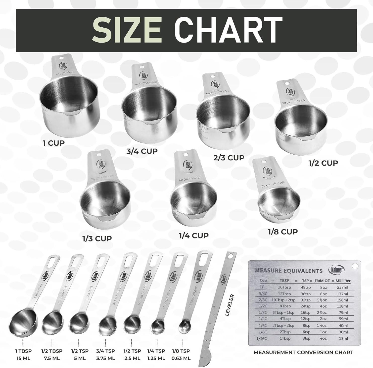- Having the right measurments is the key to success: Kaluns is serving you with a variety of 14 cups and spoons so every dish you serve and every cake you bake should be spiced to perfection. Use our bonus levler to have your spices and sauces accurately measured. Are you following a recipe and confused of how to covert measurments? - Don't worry, just turn to the measurment conversion chart and check, Kaluns has made it easy for you.