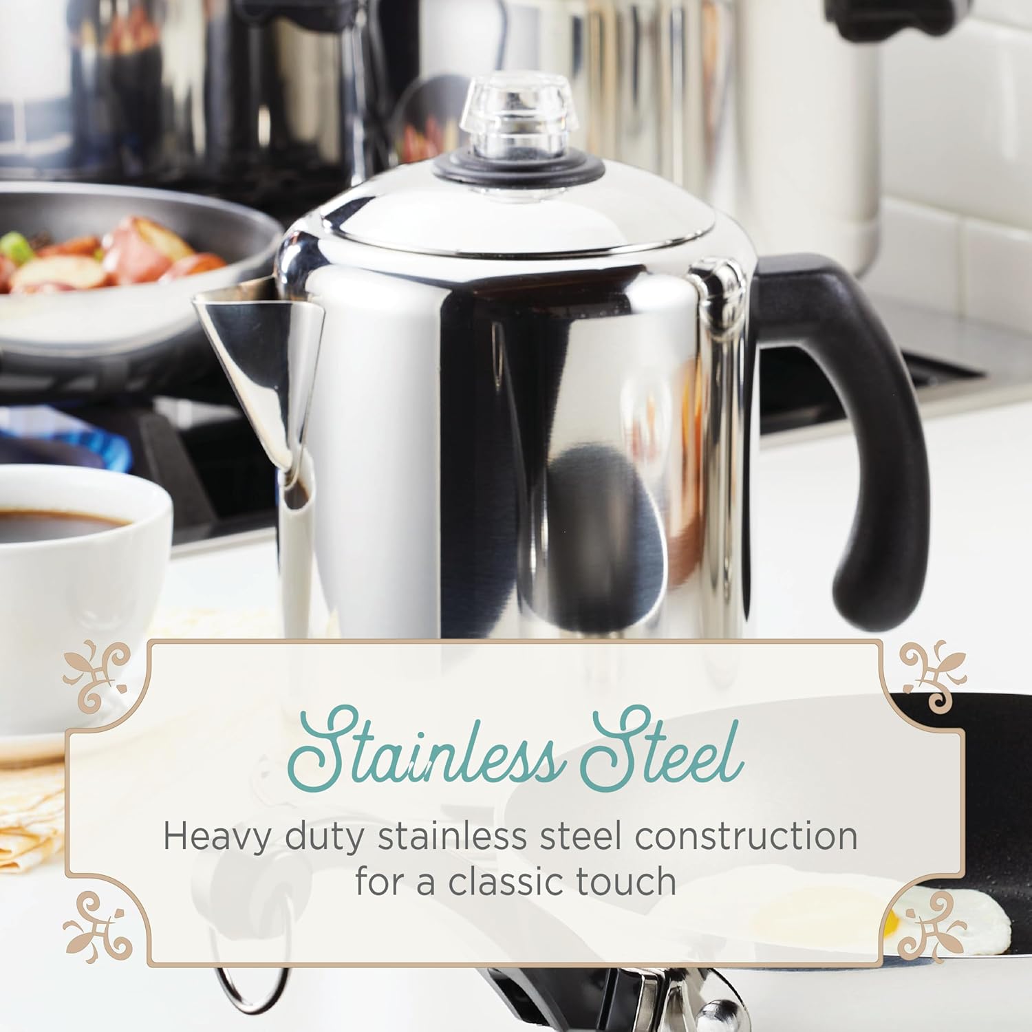 - PERFECTLY POLISHED: Heavy-duty stainless steel percolator makes up to 12-cups of coffee and is finshed with a mirror polish