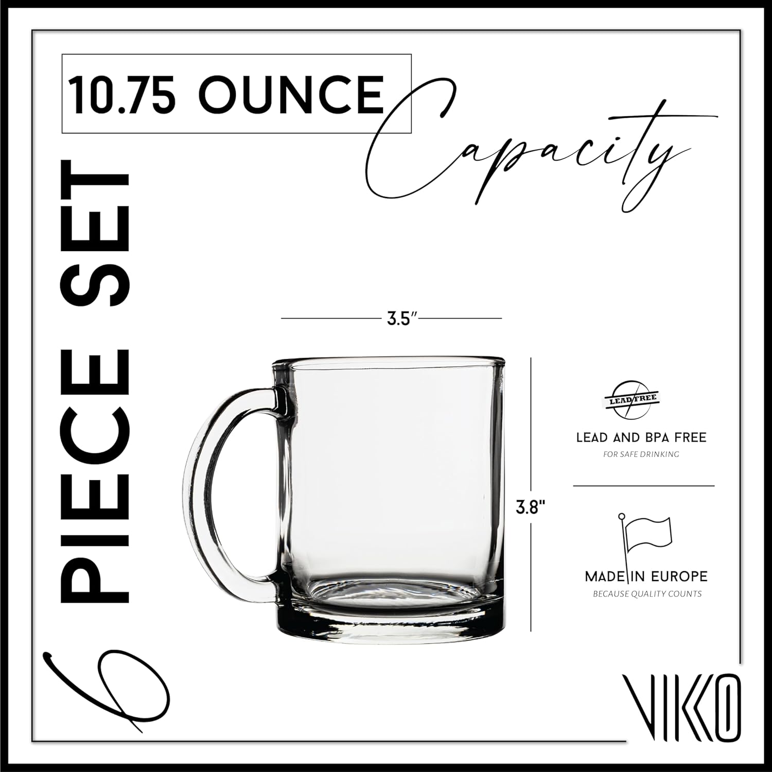 Vikko Glass Coffee Mug Set of 6, 10.75 Ounce Clear Mugs, Microwave and Dishwasher Safe