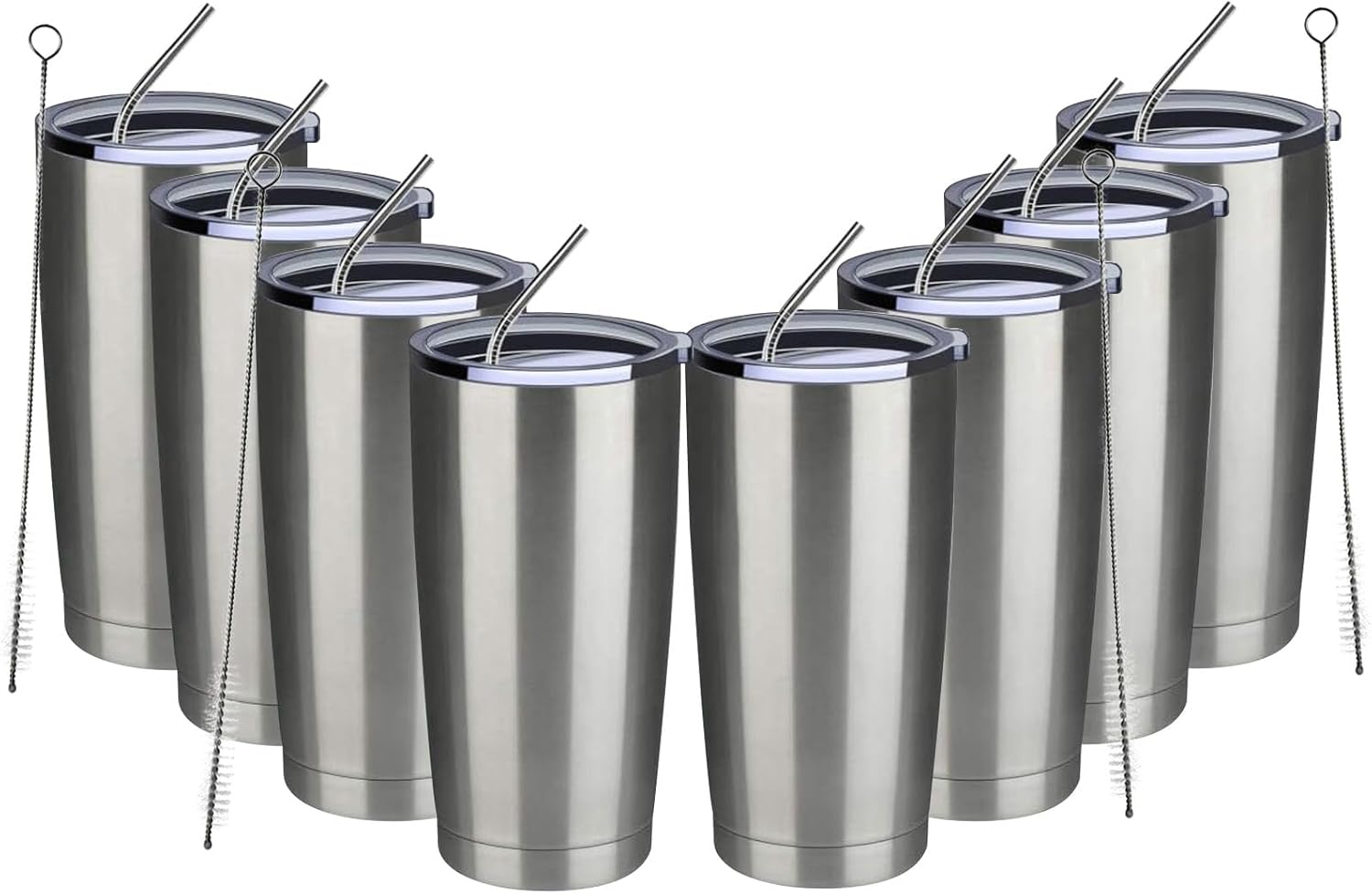 MEWAY 20oz Tumbler 8 Pack Double Wall Vacuum Insulated Travel Mug Bulk, Stainless Steel Tumblers with Lid and Straw, Durable Powder Coated Coffee Cups for Cold & Hot Drinks (Silver, 8)