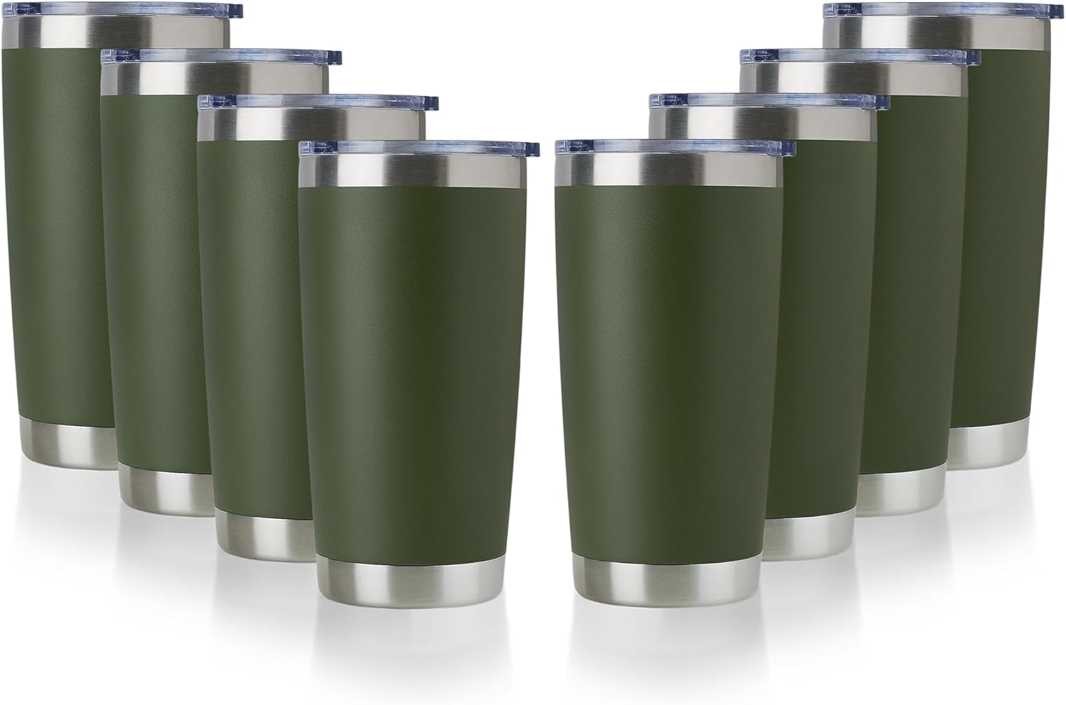 DOMICARE 20oz Stainless Steel Tumbler Bulk with Lid, Double Wall Vacuum Insulated Travel Mug, Powder Coated Coffee Cup, Army Green, 8 Pack
