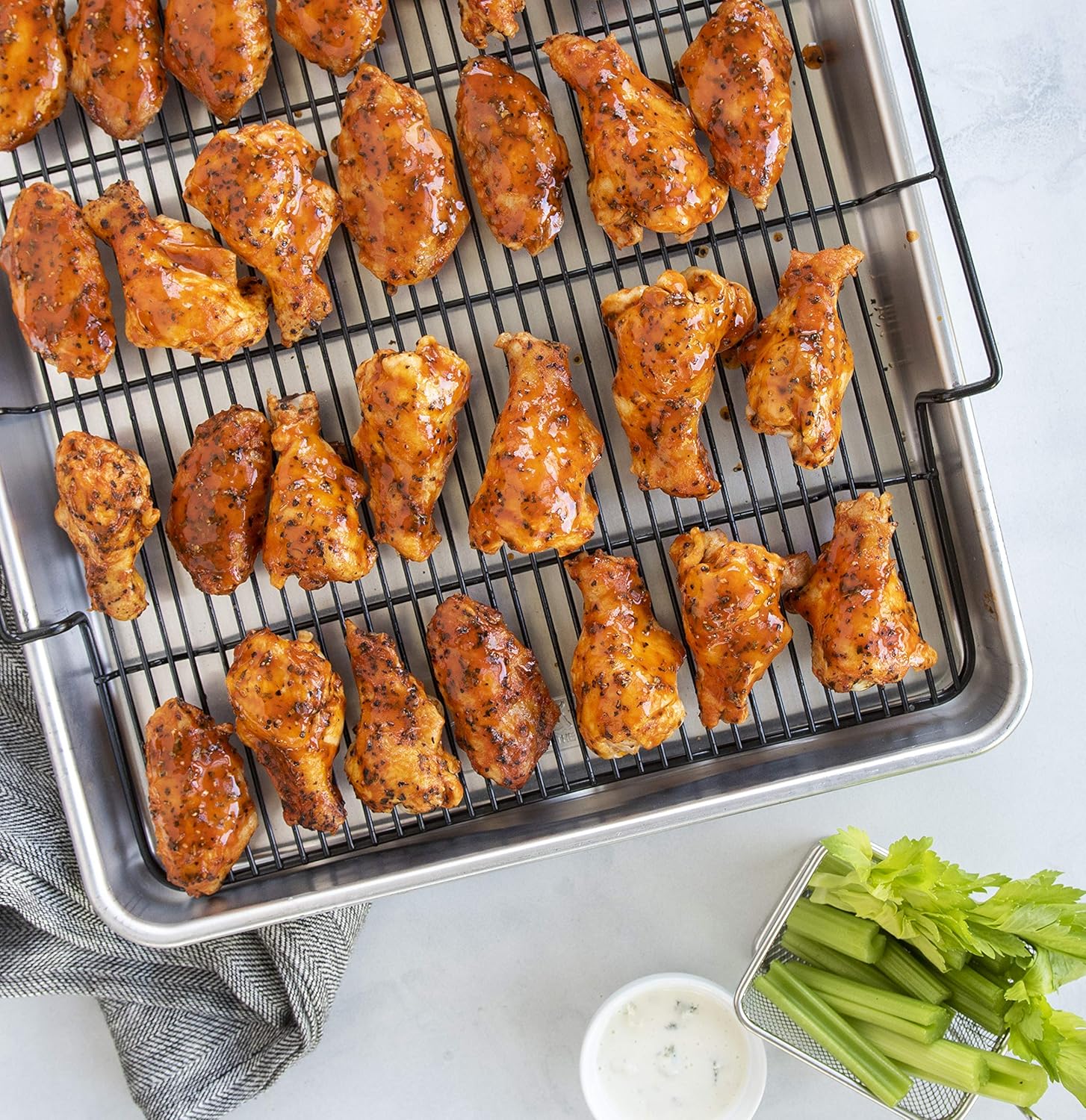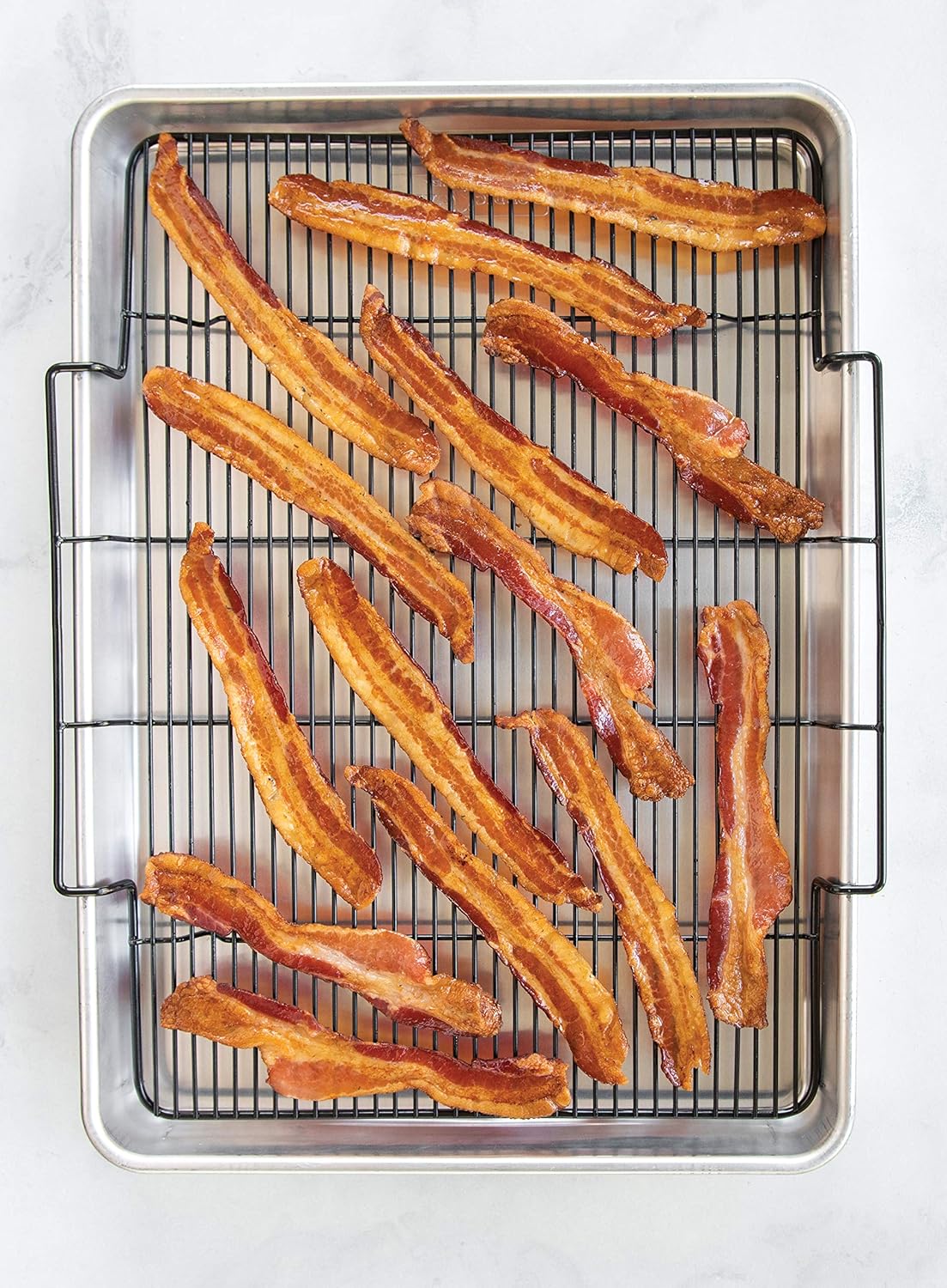 - Pan made of aluminum with carbon steel rack and heat safe up to 400 degrees