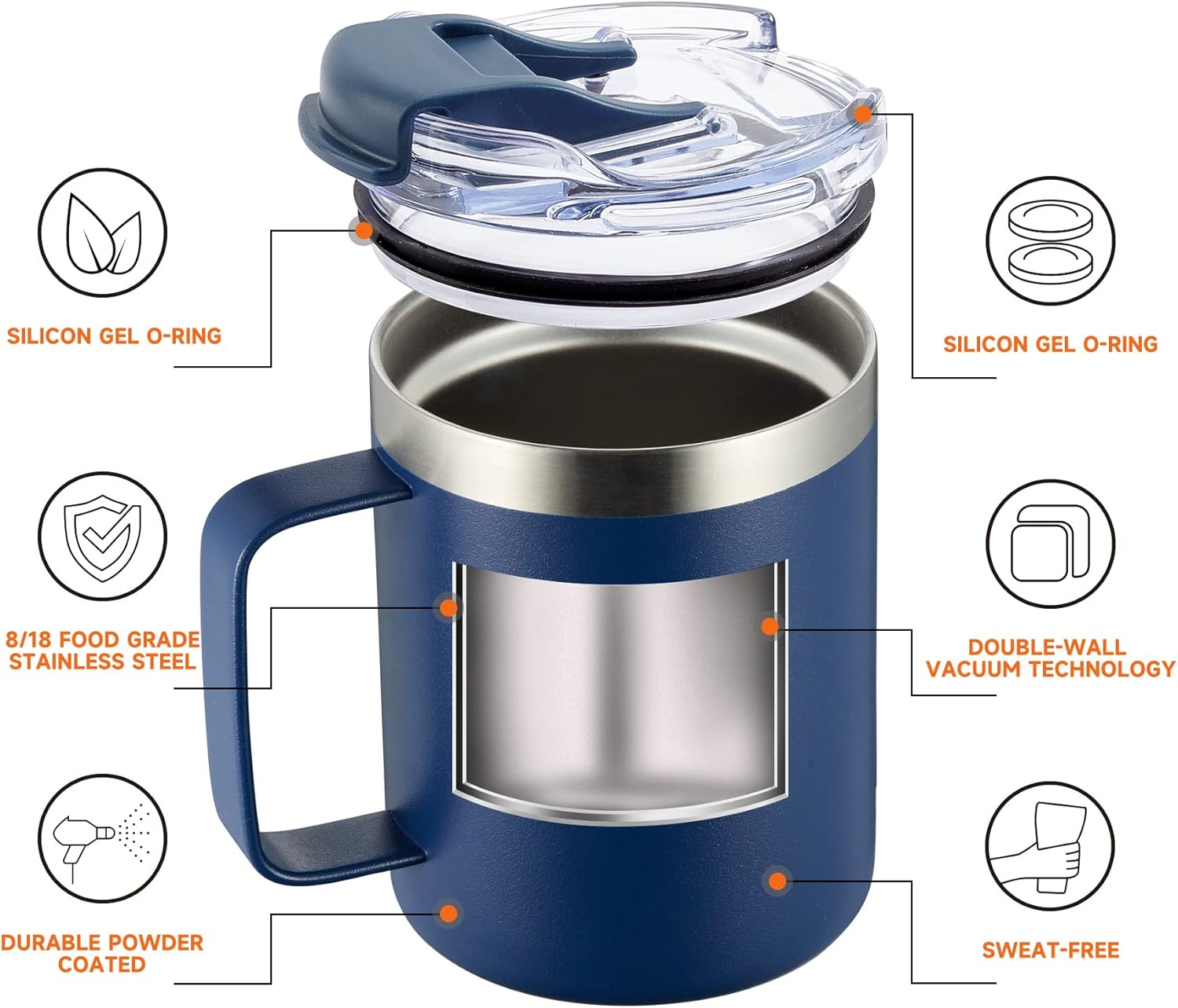 ALOUFEA 12oz Stainless Steel Insulated Coffee Mug with Handle, Double Wall Vacuum Tumbler Cup with Fliping Lid, Navy, 2 Pack