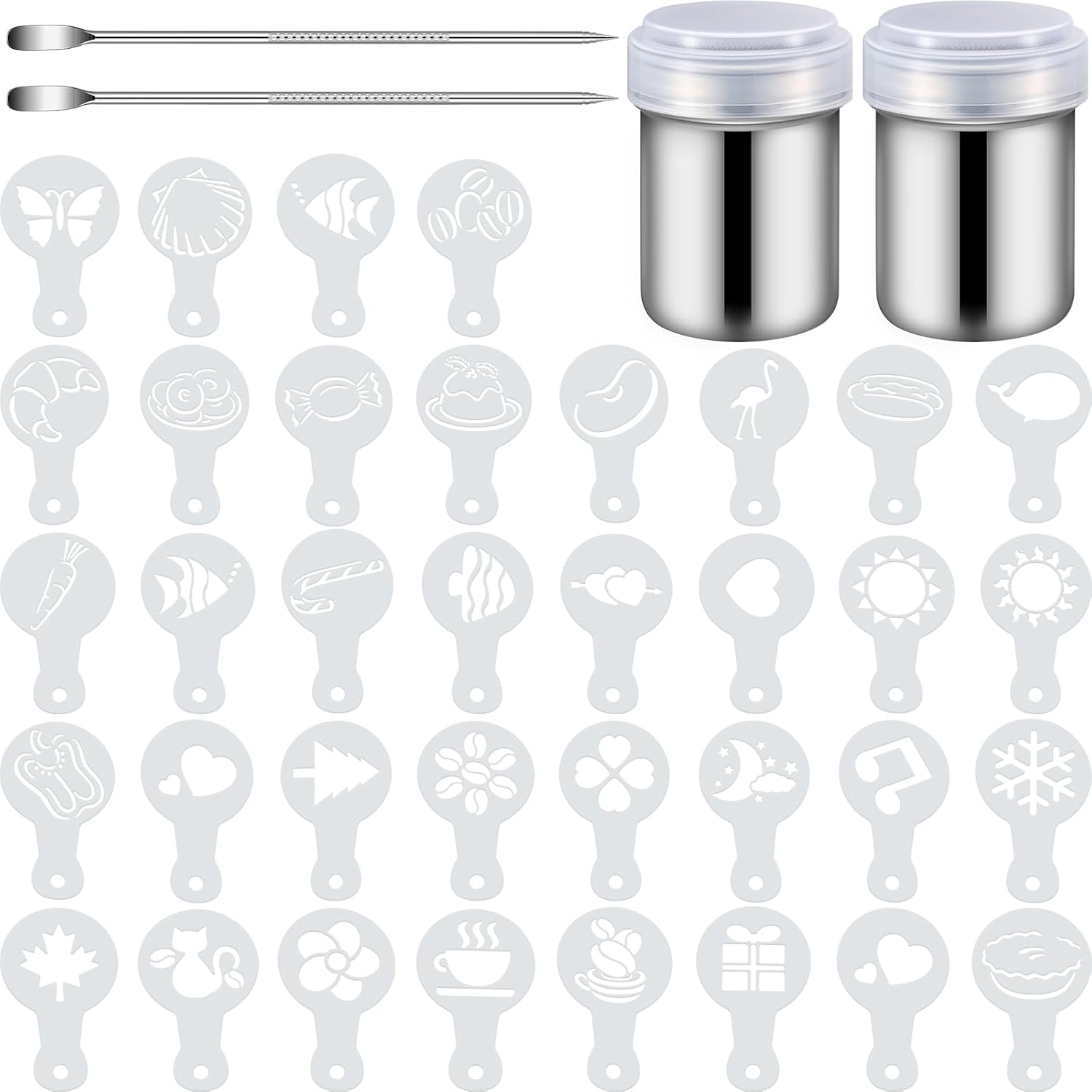 - What you receive: package comes with 72 pieces coffee decorating stencils in 36 different patterns, 2 pieces latte art pens, and 2 pieces dusting cans, enough quantity and different styles can meet your various needs, can bring you more happiness when you enjoy the coffee
