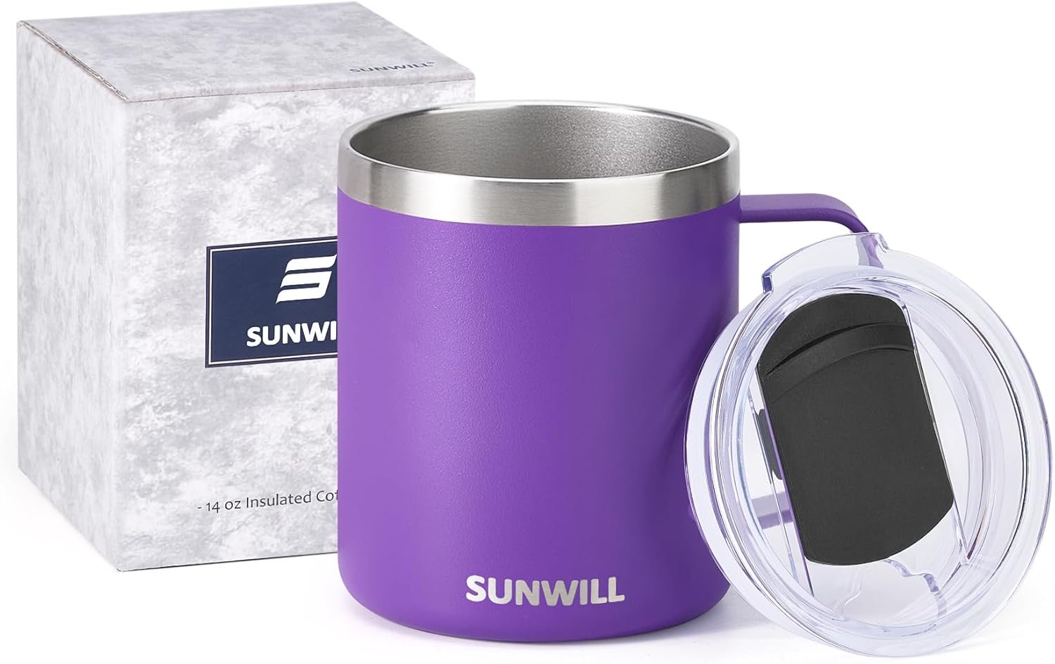 SUNWILL Insulated Coffee Mug with Lid, Travel Tumbler with Handle, 14 oz Stainless Steel Cup for Camping, Office, Home, Powder Coated Purple