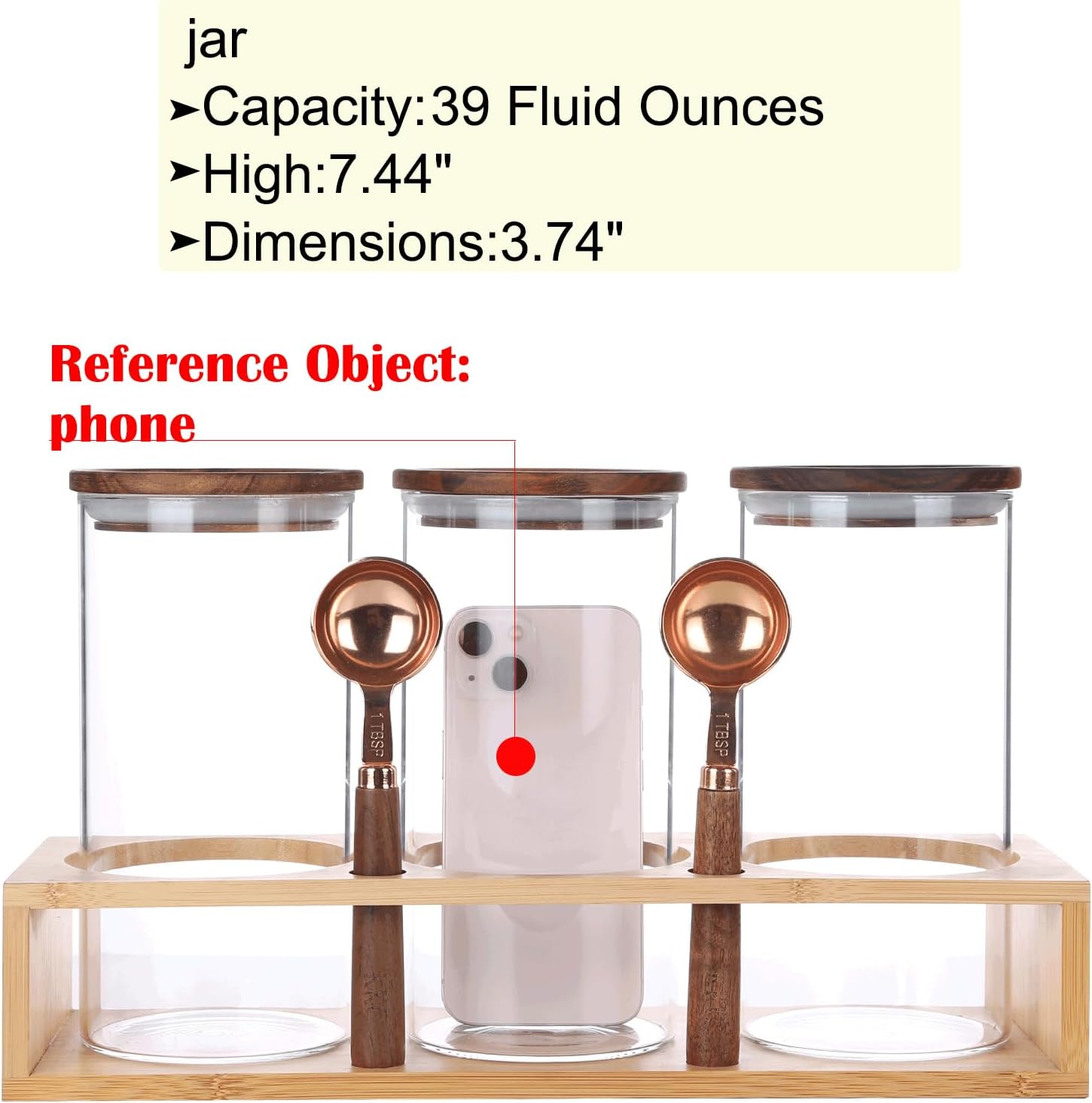 - Complete Set Includes:3 sealed glass jars(height 7.44" x diameter 3.74",capacity:39 floz/1150ml),2 wooden handle scoops(1 TBSP) and 1 bamboo rack(12.99" x 4.5" x 2.76",L x W x H),label stickers.