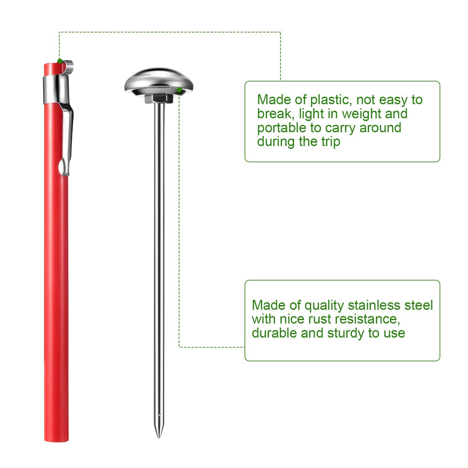 - Sturdy and portable: mainly made of quality stainless steel, these pocket dial thermometers are with nice rust resistance, durable and sturdy to use, the protective sleeve is made of plastic, not easy to break, light in weight and portable to carry around during the trip
