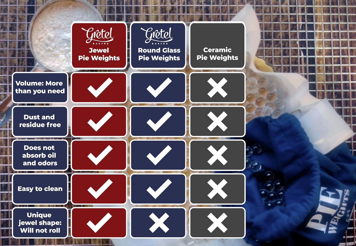 - For the perfect pie crust - These pie weights are an essential addition to your baking accessories! Pre-bake your pastry and prevent it from puffing up, bubbling or shrinking during blind baking.