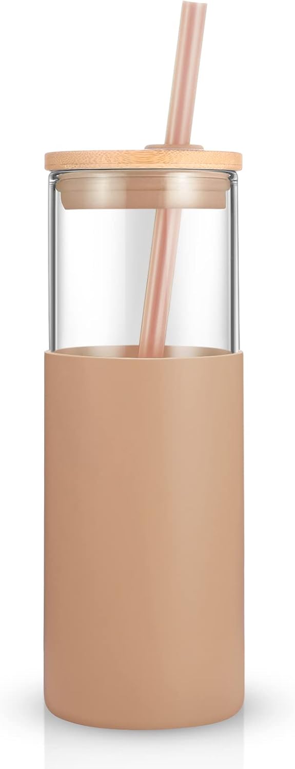 Tronco 24 oz Glass Tumbler with Straw and Lid - Glass Cup with Lid and Straw, Smoothie Cup, Iced Coffee Cup - Bamboo Lid and Protective Silicone Sleeve - BPA-Free