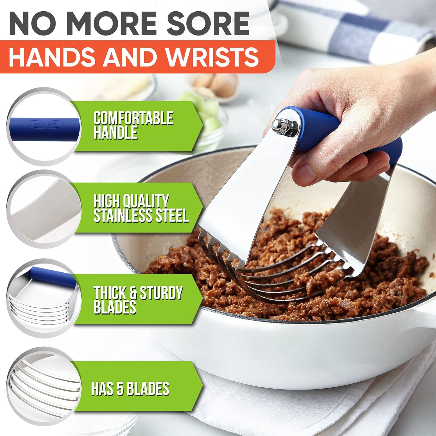 Spring Chef Large Dough Blender For Baking, Stainless Steel Puff Pastry Cutter Tool with Sharp & Thick Blades, Dishwasher Safe Dough Cutter Tool, Manual Pastry Blender for Easy Mixing - Sapphire