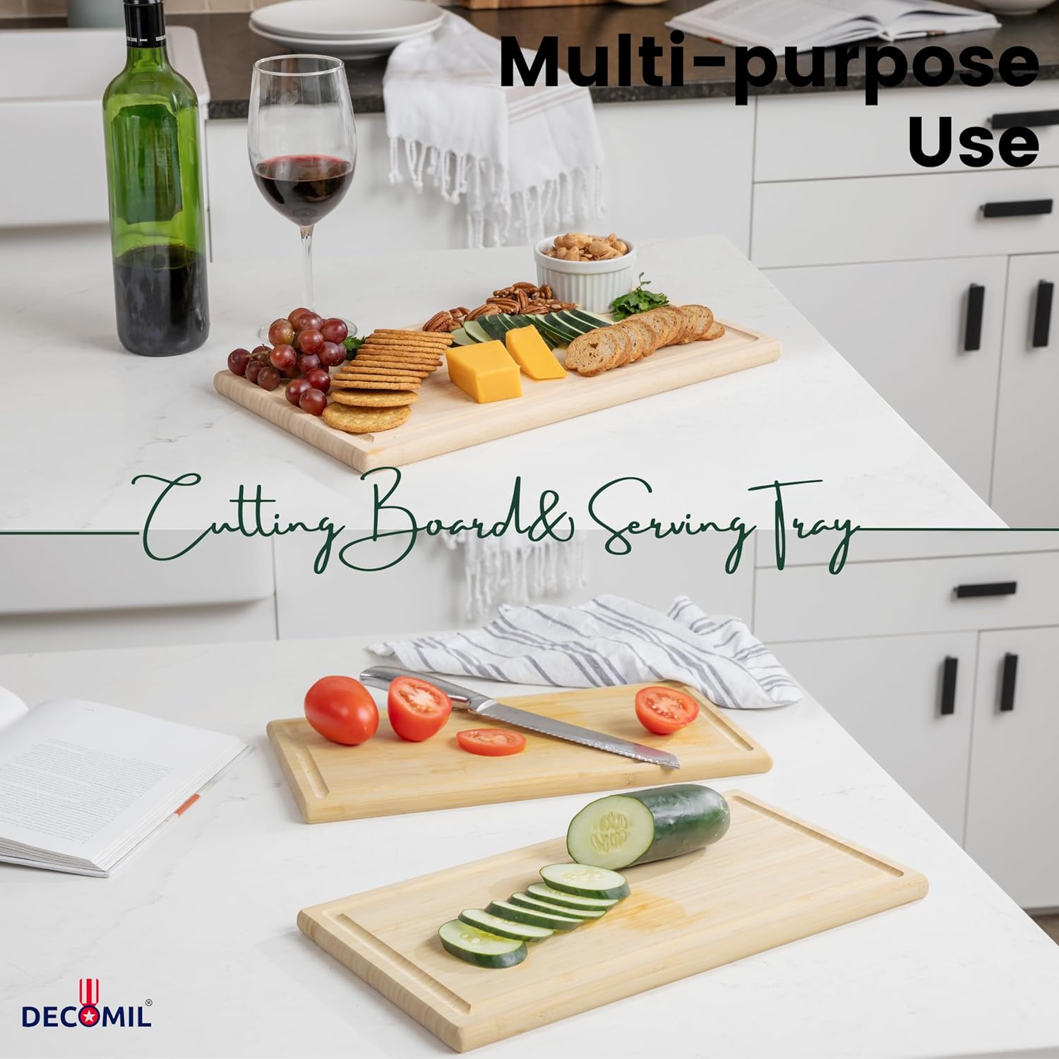 - 🔁Versatile Cutting and Serving Board: Our cutting board, crafted from NATURAL ORGANIC BAMBOO, is designed to do more than just chopping meat. It excels at slicing bread, fruits, vegetables, meats, steaks, and cheeses, making it a true multitasker in the kitchen. Additionally, it doubles as an elegant serving board, perfect for presenting a variety of culinary delights.
