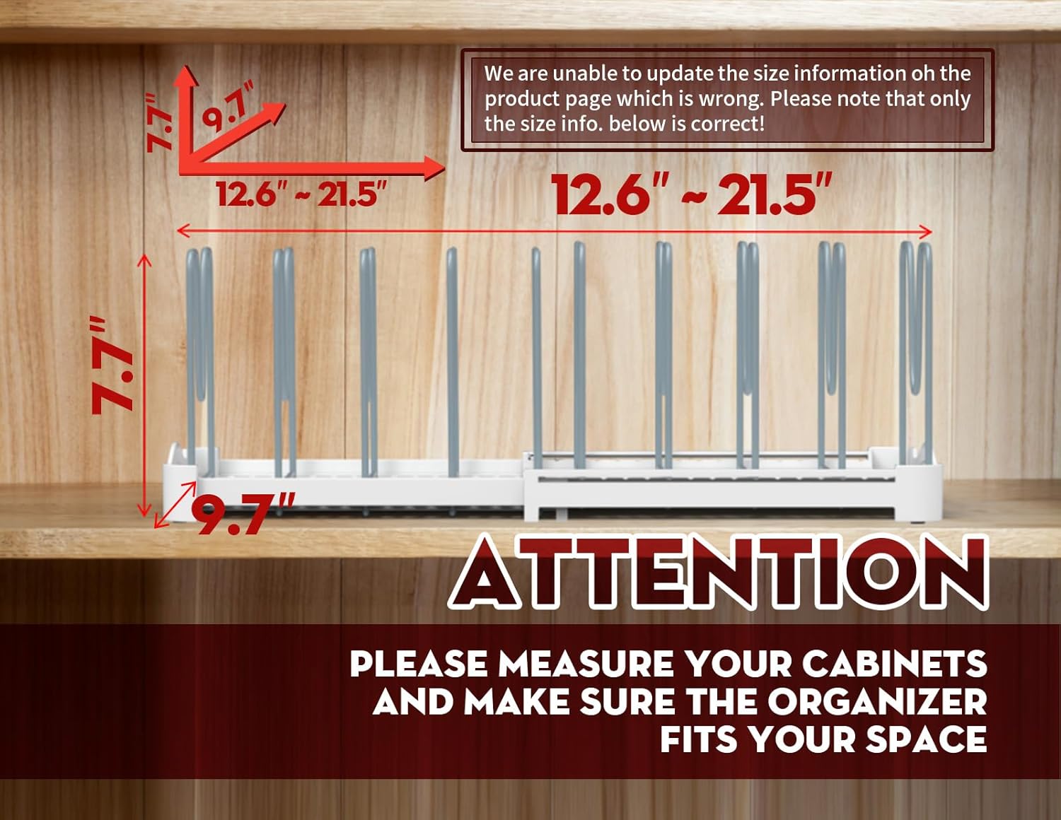 - Pot Lid Organizer - Organizes pot lids, container lids, cake molds, cutting boards, drying mats etc. Product size is 7.7'' deep, 8.3'' high, extendable width is from 12.6'' to 21.5''.