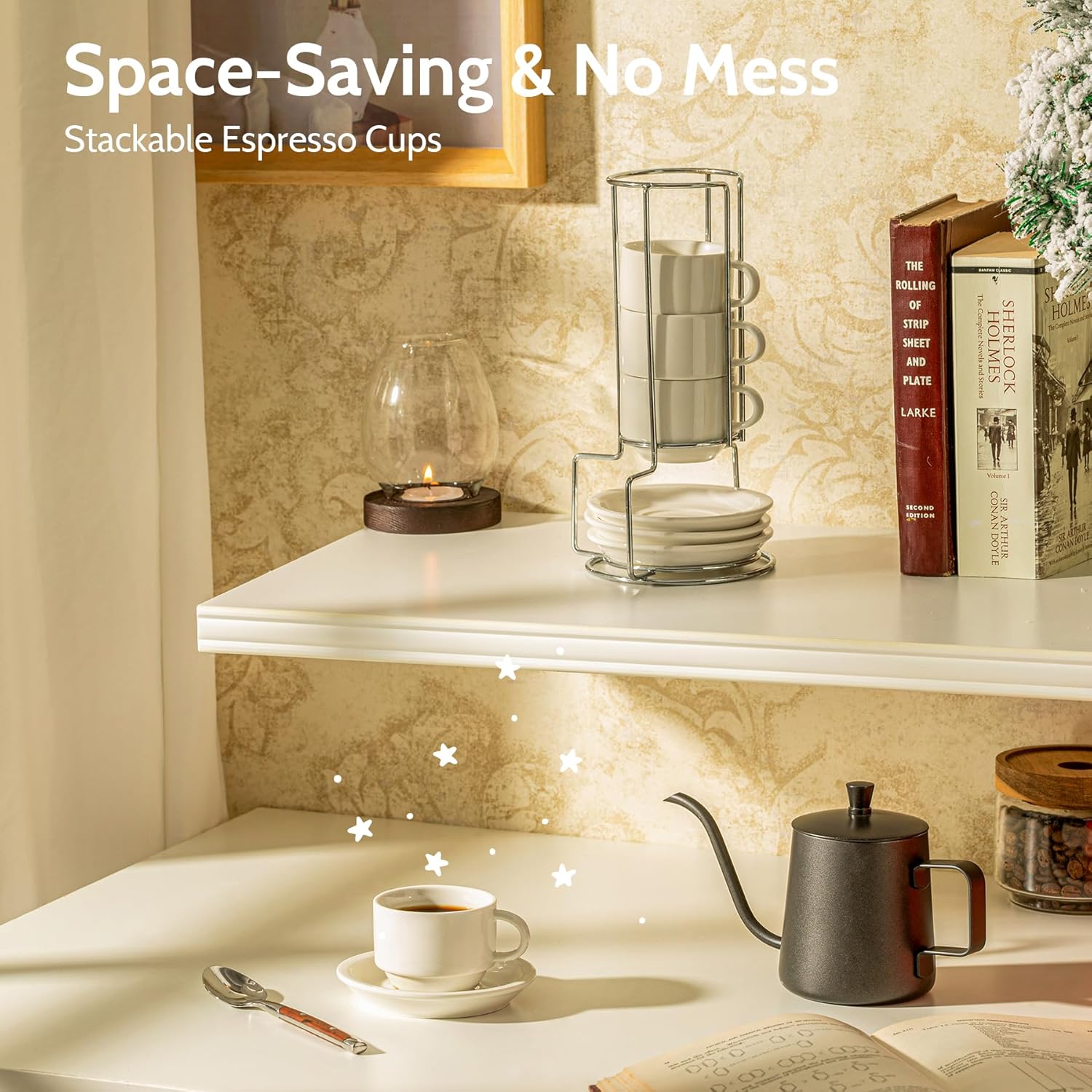 Sweese 4 Ounce Porcelain Stackable Espresso Cups with Saucers and Metal Stand Set of 4, White