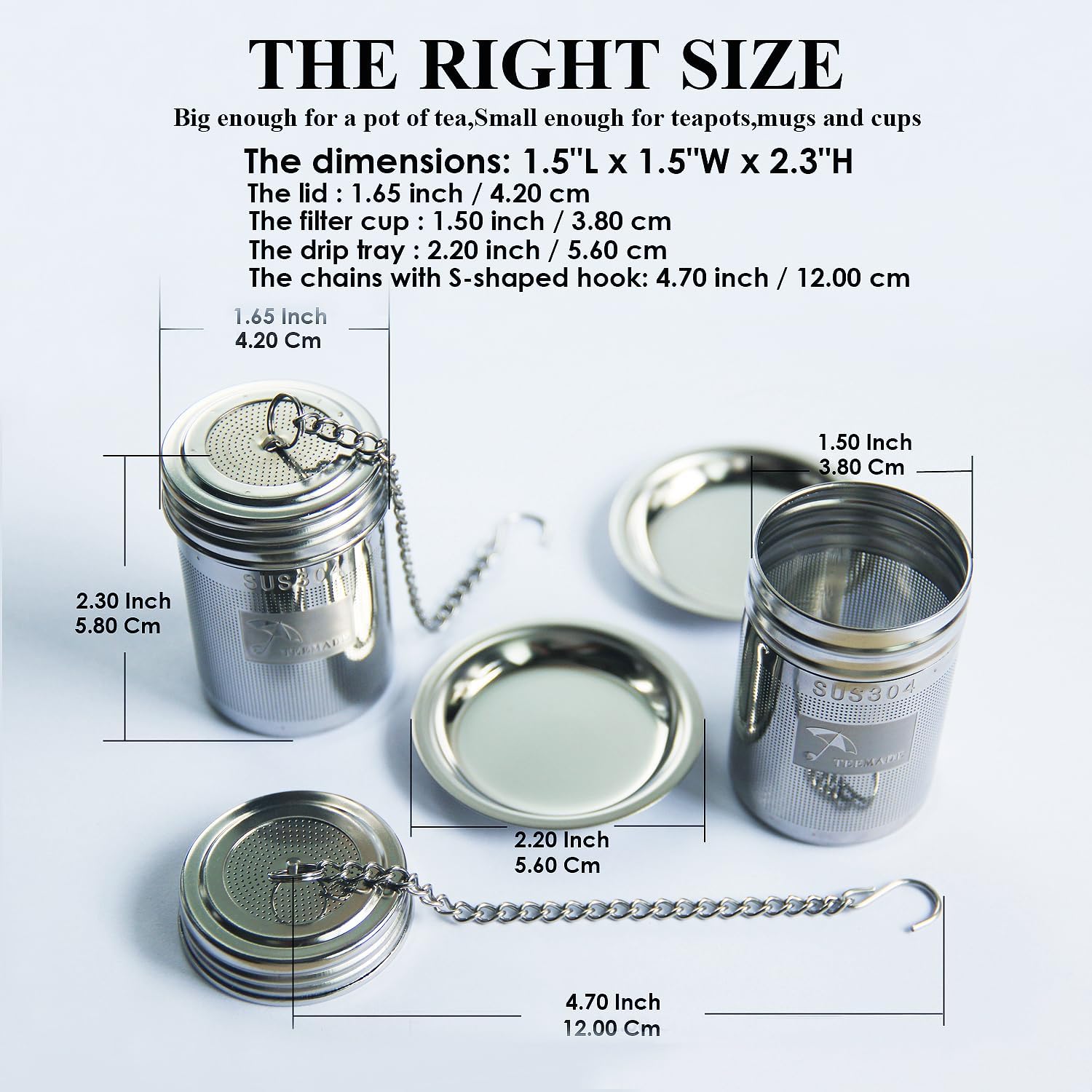- ✅With extended 4.7" chains and S-shaped hooks, our tea infuser is versatile enough to fit different sized containers, from mugs to teapots and mason jars. Retrieving the tea leaves after use is also a breeze with this feature. Plus, our mini drip tray avoids any mess after removing the infuser, making it a convenient and easy-to-use tool for your tea brewing needs.