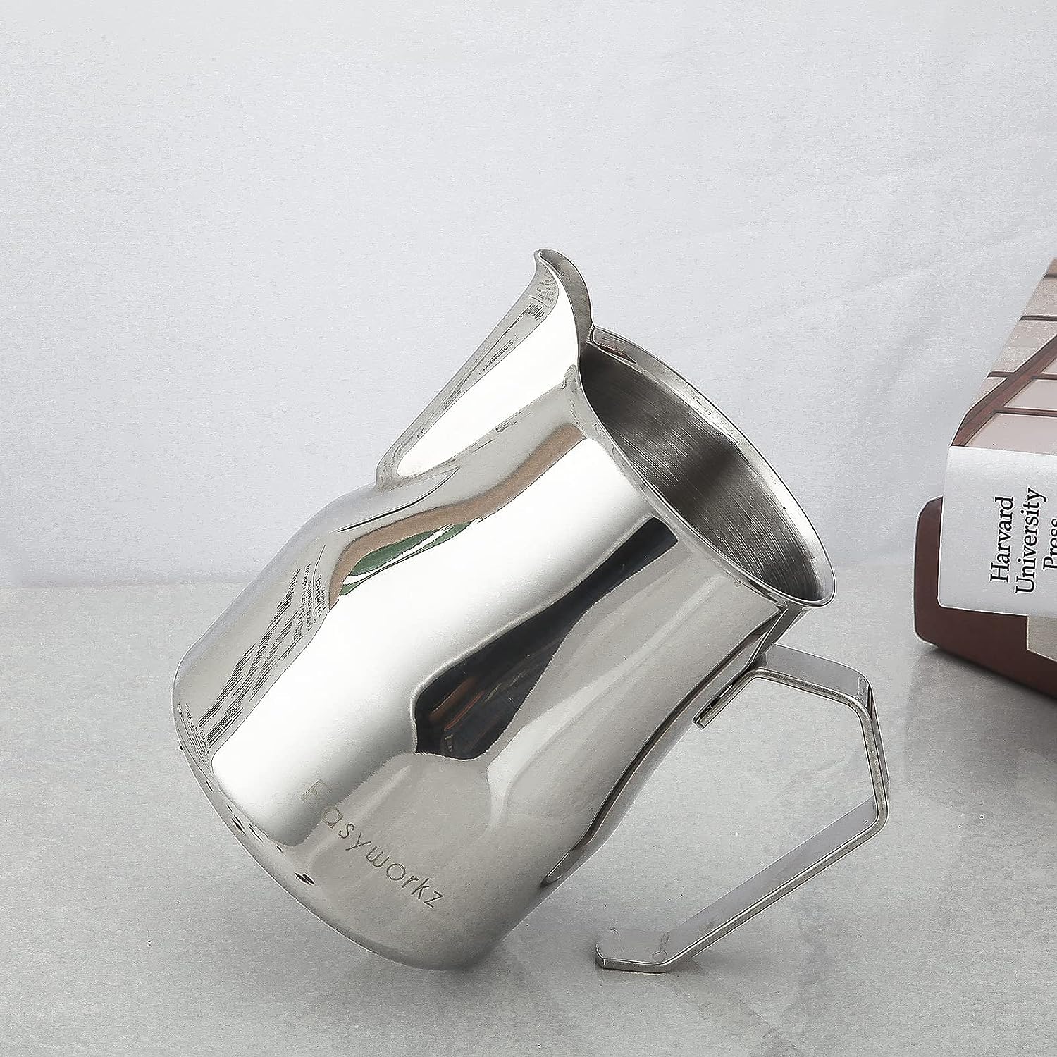 - The simple design and dripless spout means no mess and perfect latter art.With heat-resistant and welded sturdy handle,easy to grip and pour.