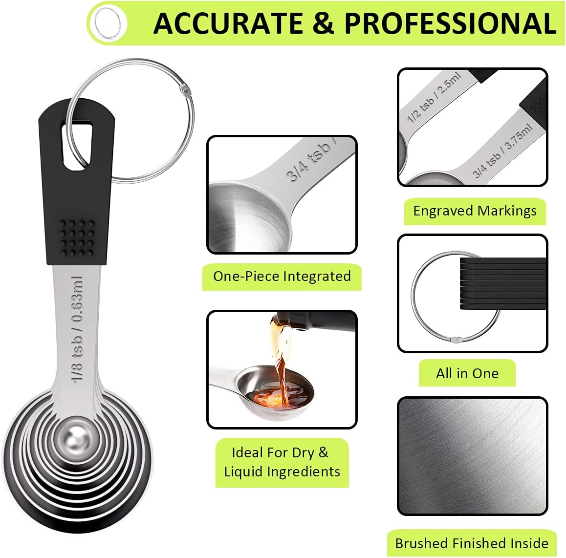 - SPECIAL DESIGN: The BPA-free black silicone handles add a trendy look to your kitchen. What’s more, the silicone provides a solid grip to help ensure the cups and spoons won't slip even with greasy hands. The cups and spoons each stacked in one bundle with a removable stainless ring which makes them easy to storage in the cabinet or hang on wall, and you can easily take apart to use them when you need