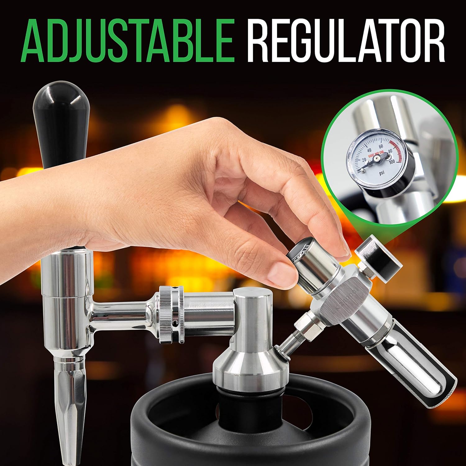 - COMPLETE BREWING KIT: Includes stout faucet, spear w/ pressure-relieving valve 75PSI, N20/N2 cartridge holder, tap handle, CO2 regulator w/ 100PSI range, silicone hose & O-ring set. Hexagonal screw cap is made easy to grip. Ideal for parties/camping
