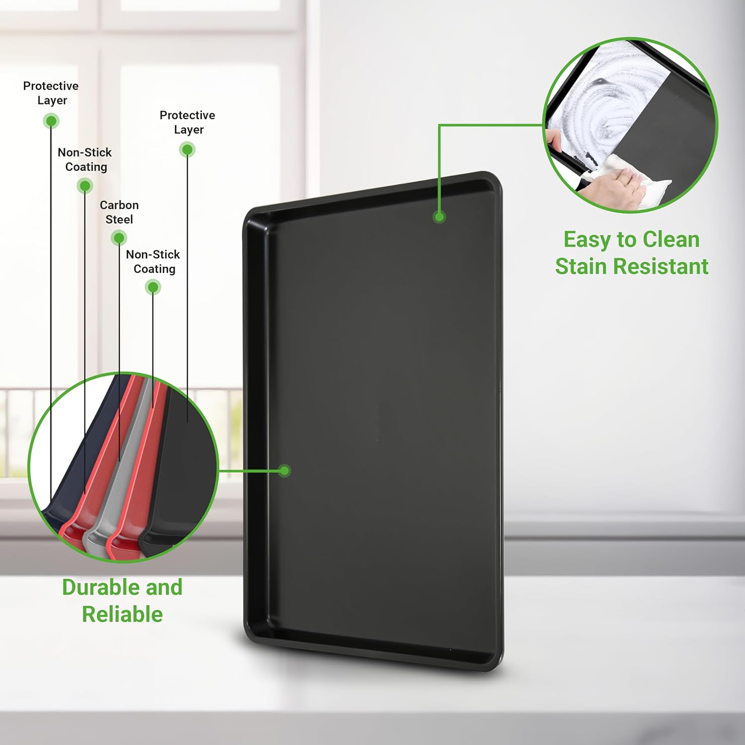 - MADE TO LAST: Features durable & reliable cookie sheet oven pan style and is made of engineered carbon steel metal alloy w/ attractive stylish metallic coating that can complement any kitchen countertop design