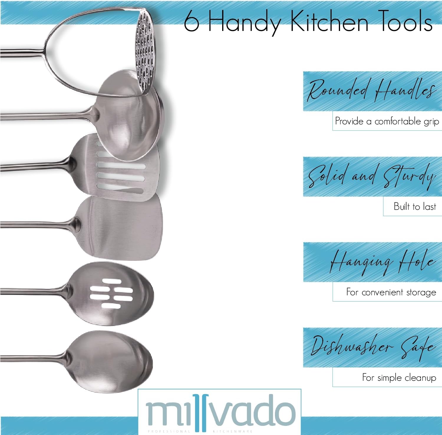 - OUTFIT YOUR KITCHEN IN STYLE: This handy six-piece kitchen utensil kit comes with all the popular kitchen tools you need to create amazing meals. From pancakes, to patties, to soups, to potatoes, to stews, these tools will help you get the job done right! Complete utensil set includes a soup ladle, a slotted spoon, a solid spoon, a slotted turner spatula, a solid turner spatula, and a potato masher. The perfect idea for the professional chef!
