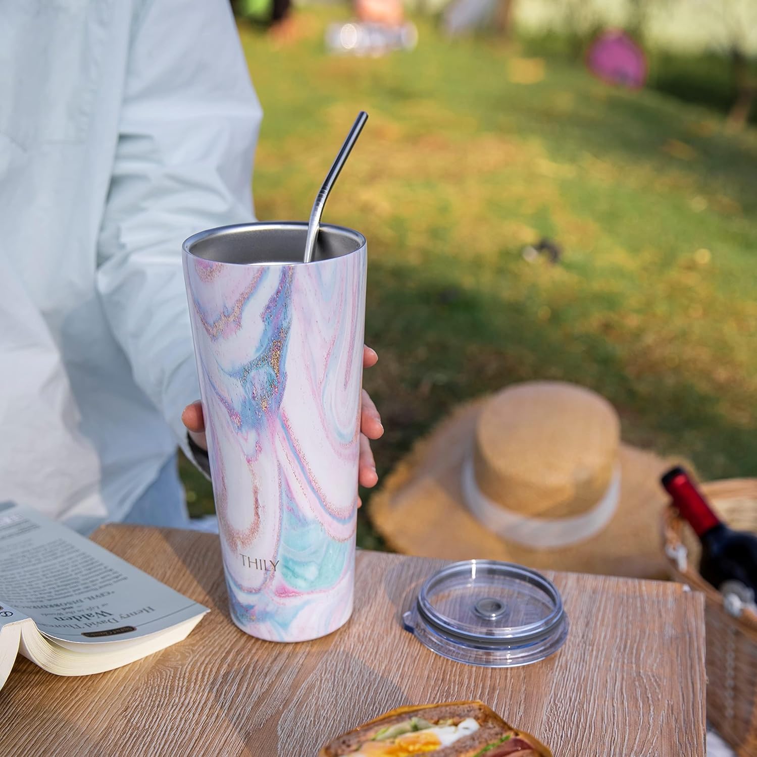 THILY Tumbler Stainless Steel Coffee Cup 26 oz Triple-Insulated Travel Mug with Splash-Proof Lid, for Ice Drinks and Hot Beverage Smoothies Cup, Pink Ripple