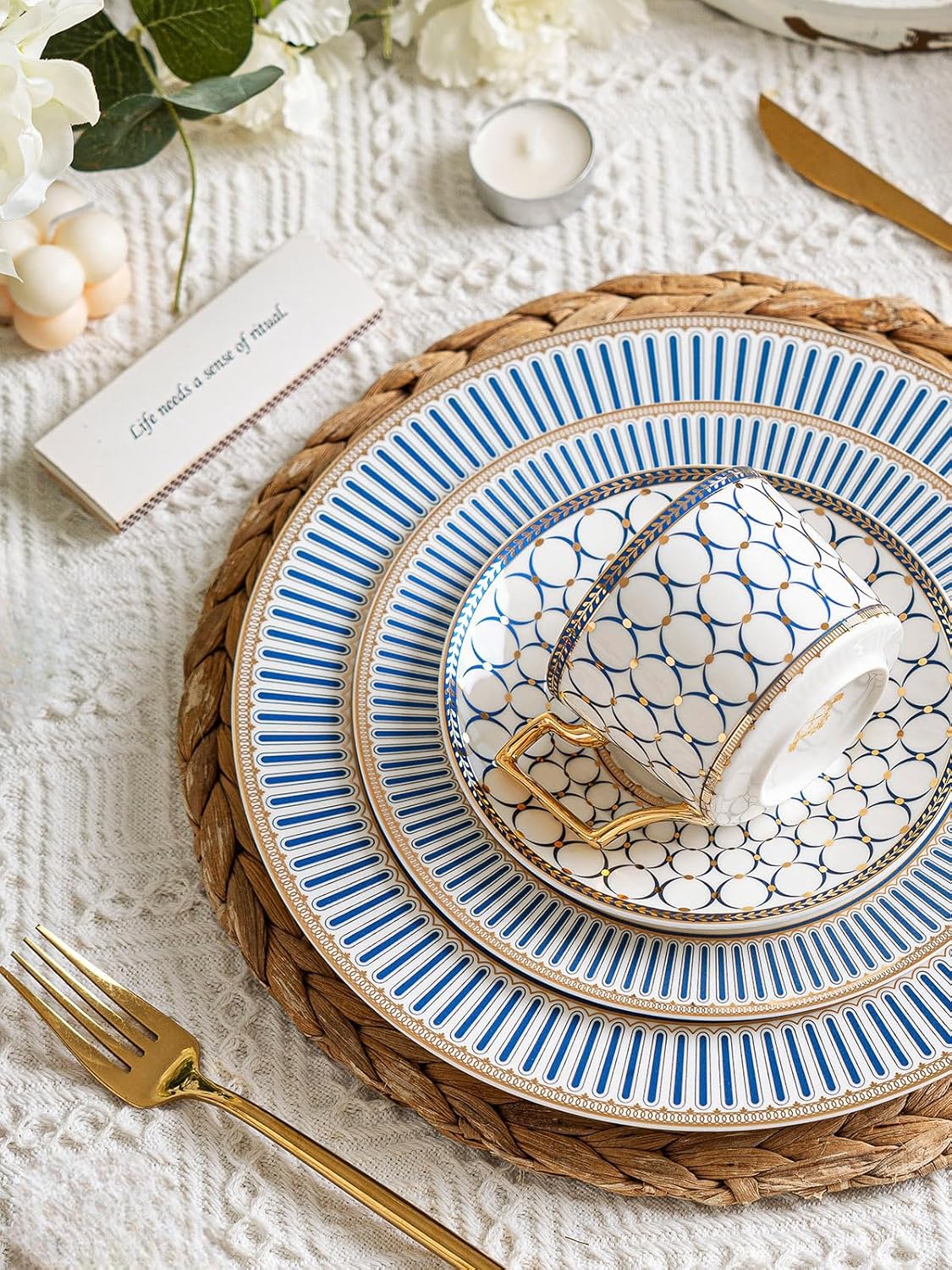 CwlwGO-European Style Ceramic Coffe Cup and Saucer Sets, 7 Oz Bone China Beautifully Glazed Blue Gold Tea Cup Set, Golden Spoon,Cappuccino, Latte, Suitable For Women's Gifts (4 pack)